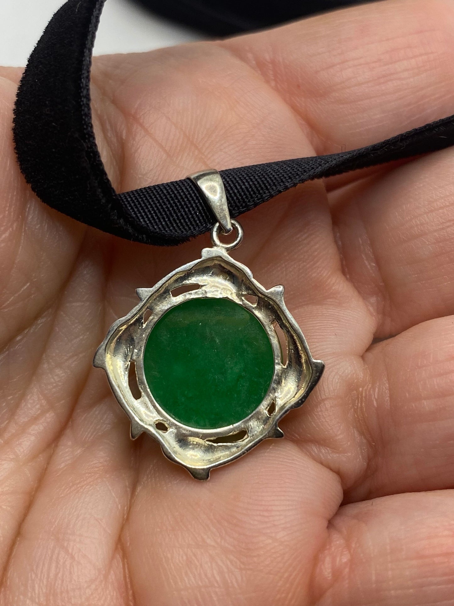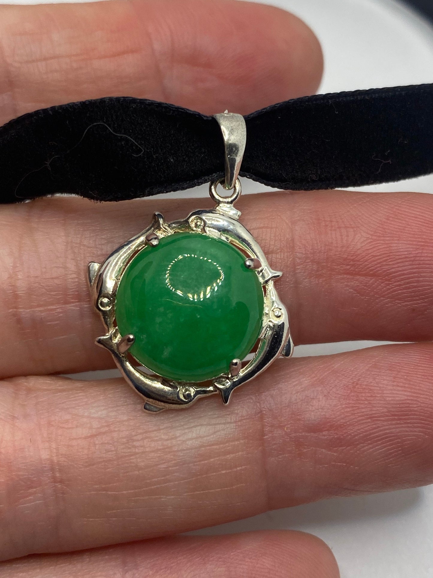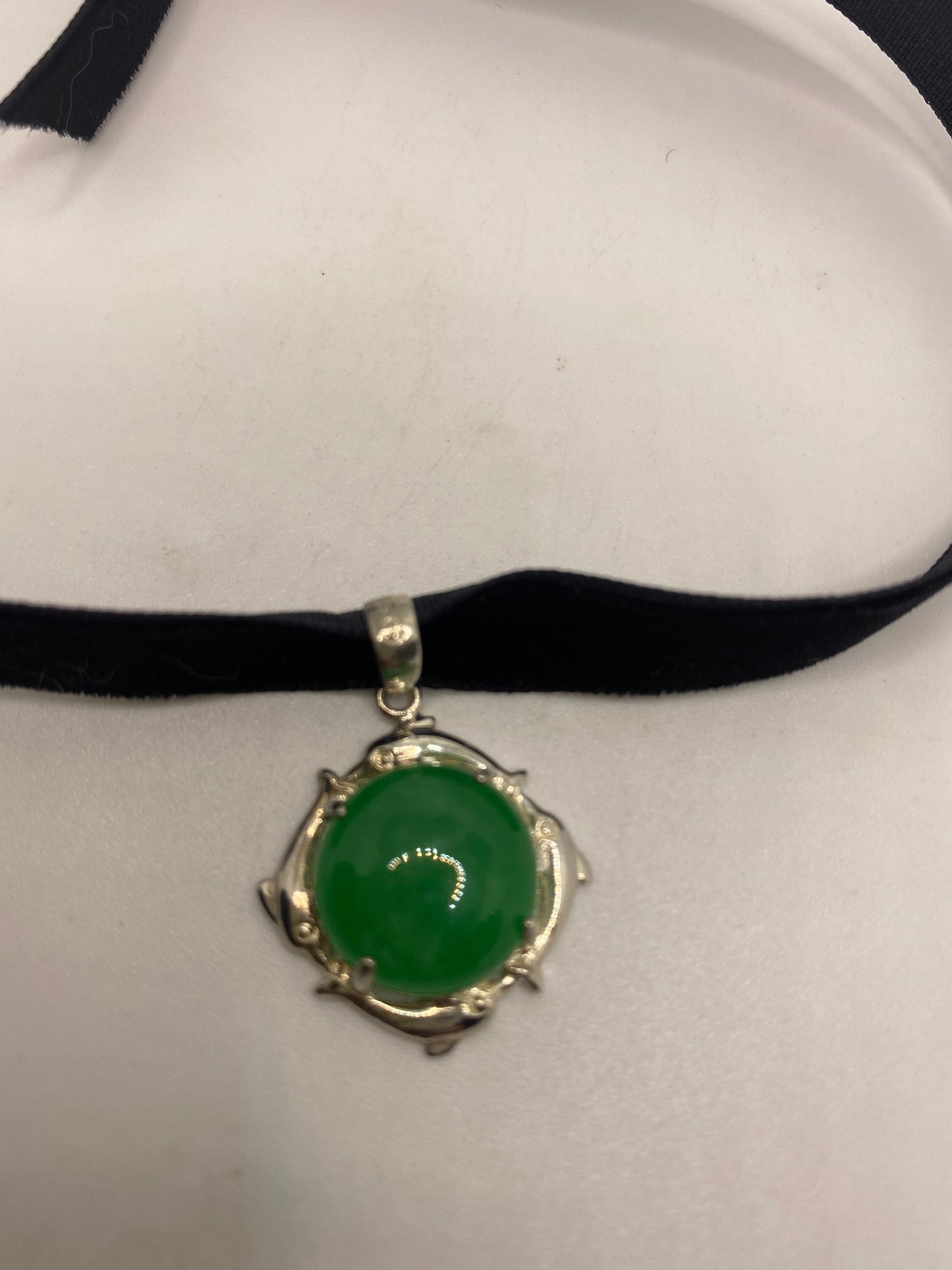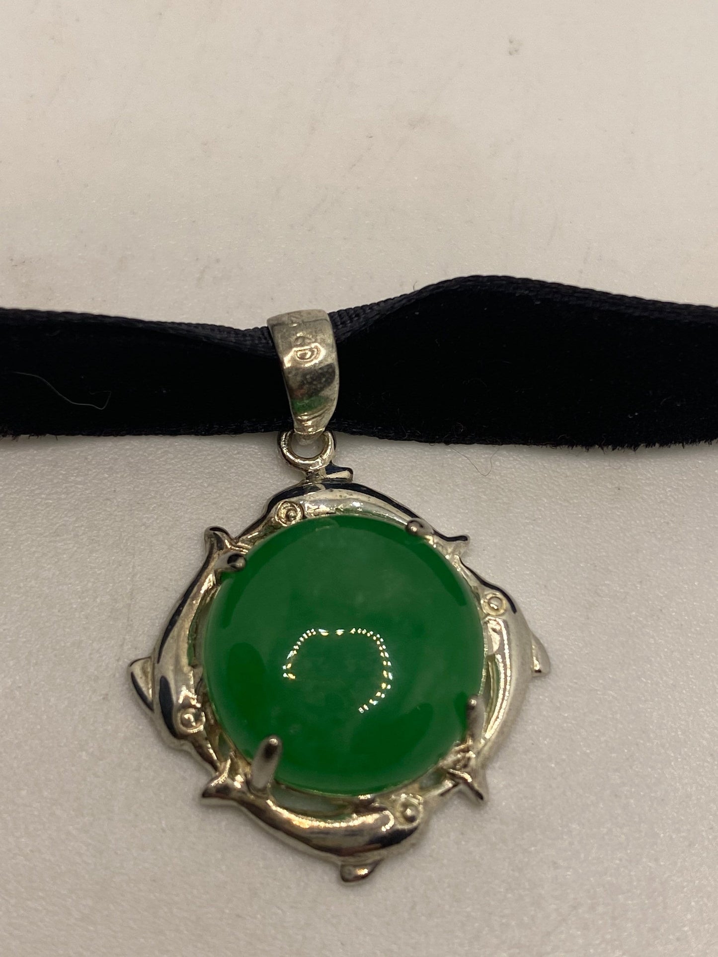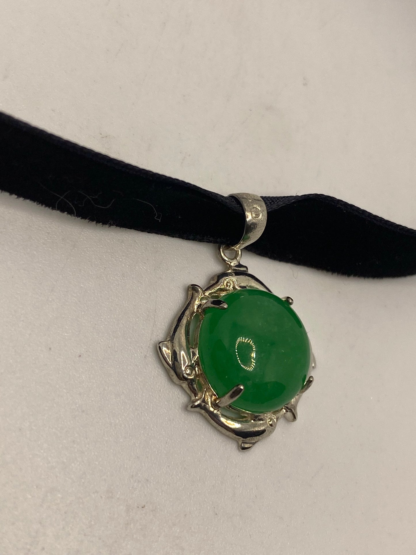 Vintage Fun Green Jade Dolphin 925 Sterling Silver Choker Black Velvet Necklace