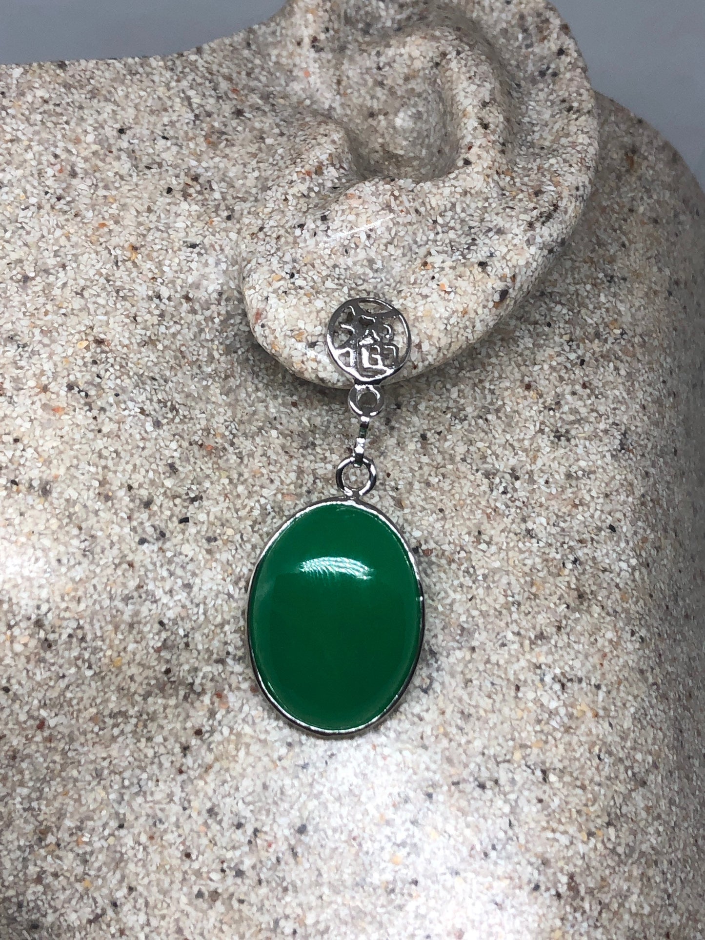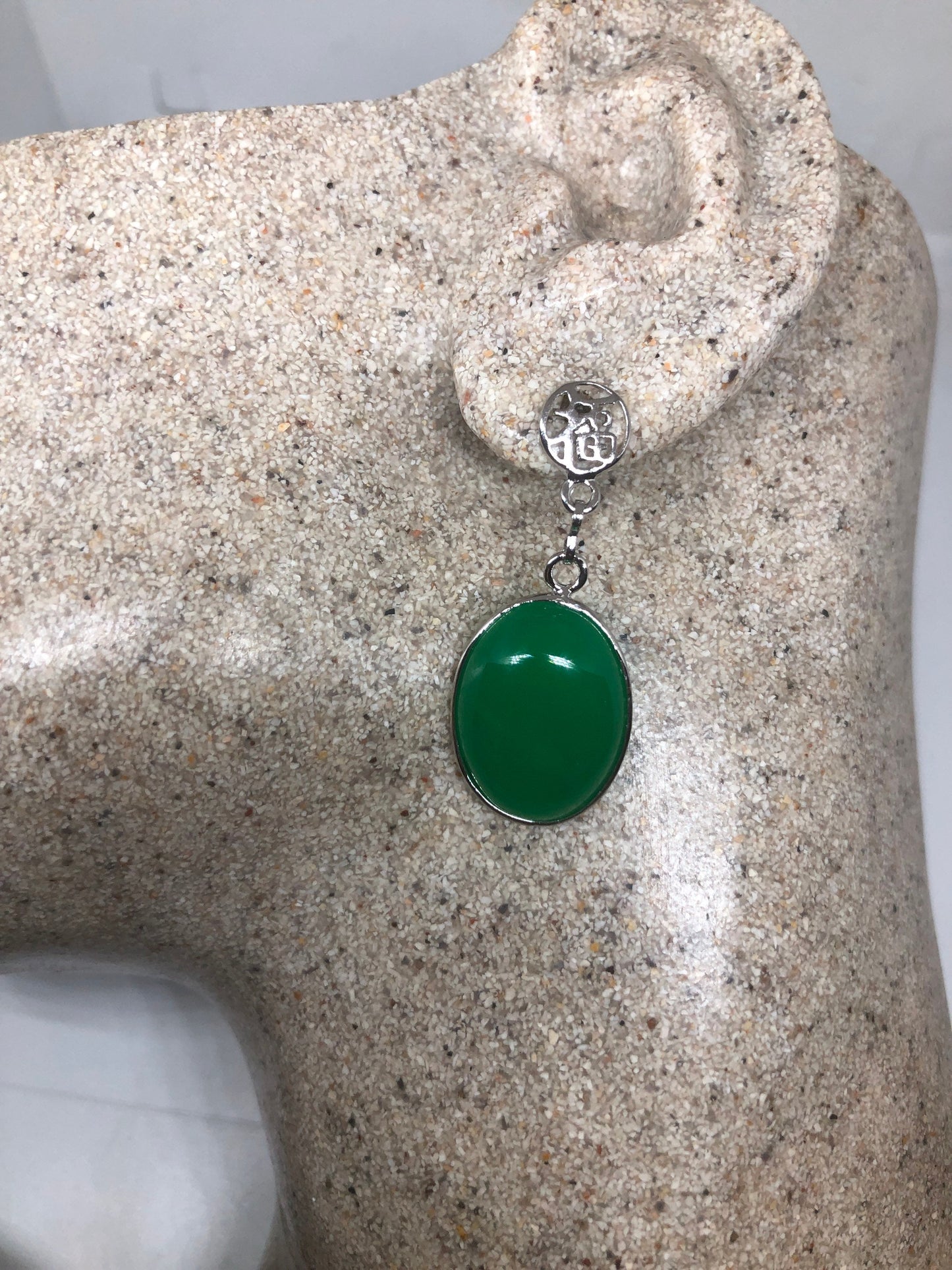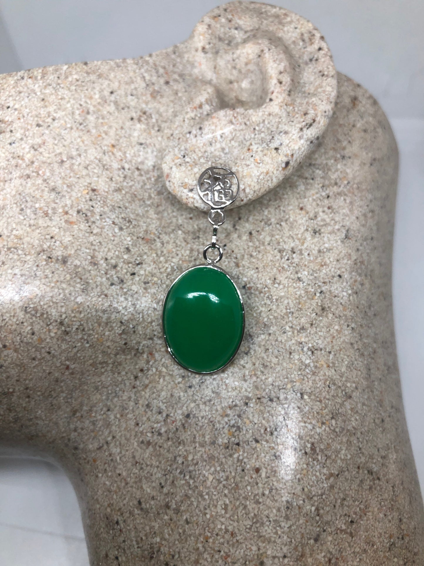 Vintage Fun Green Jade Gemstone Silver Bronze Earrings