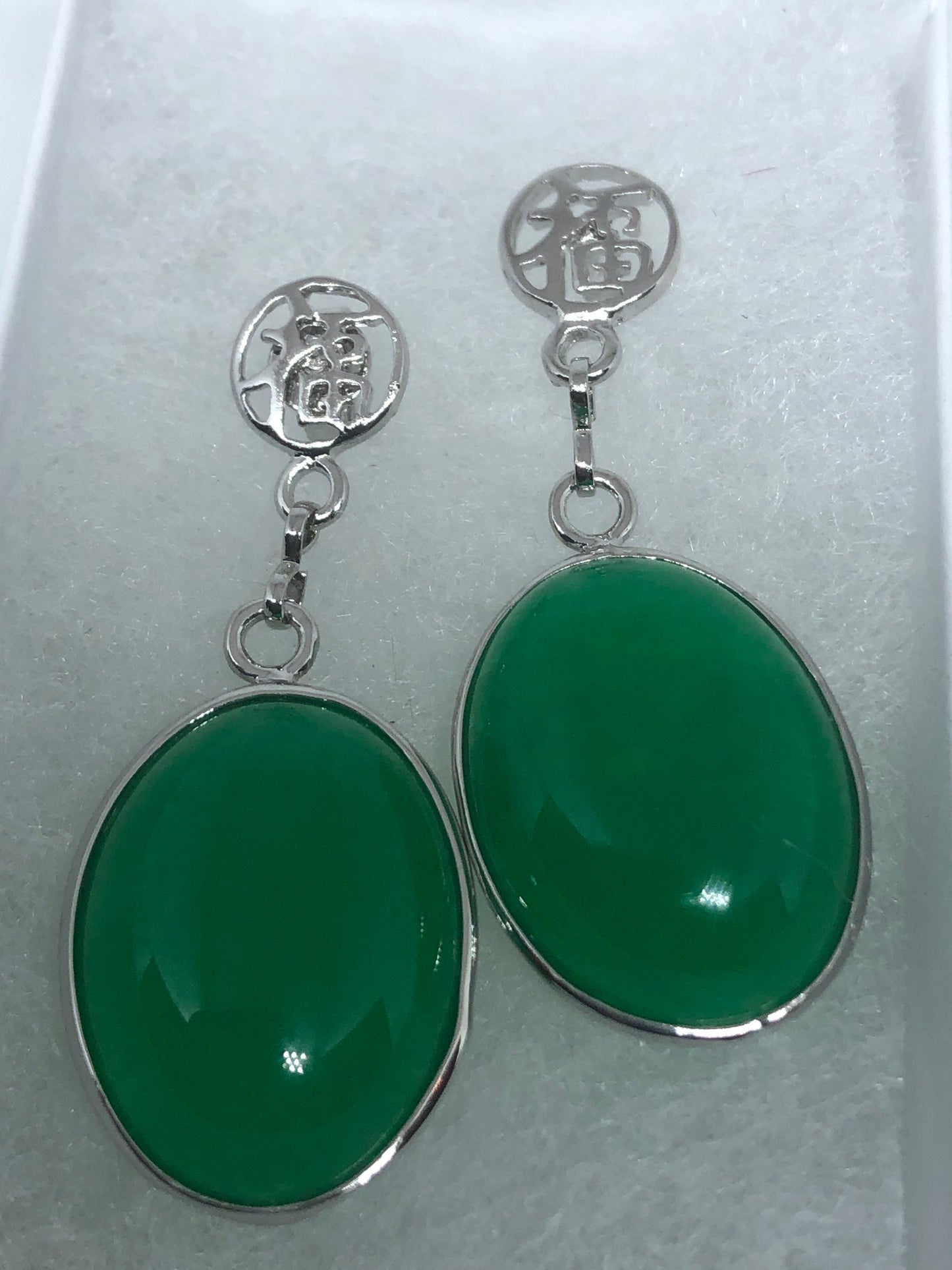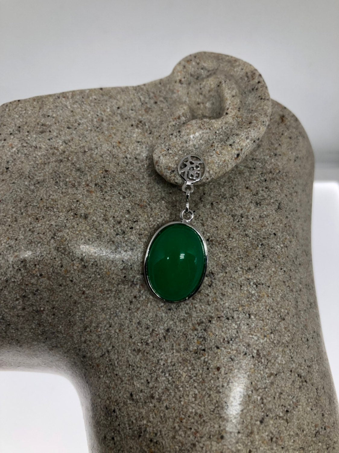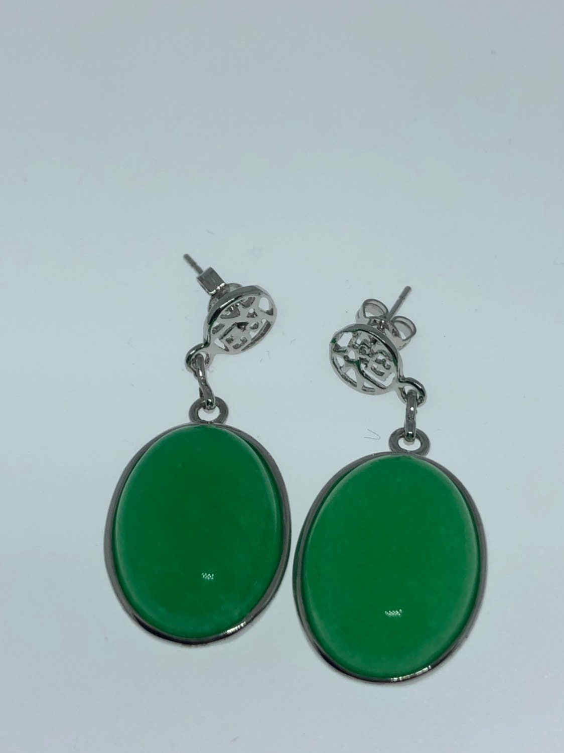 Vintage Fun Green Jade Gemstone Silver Bronze Earrings