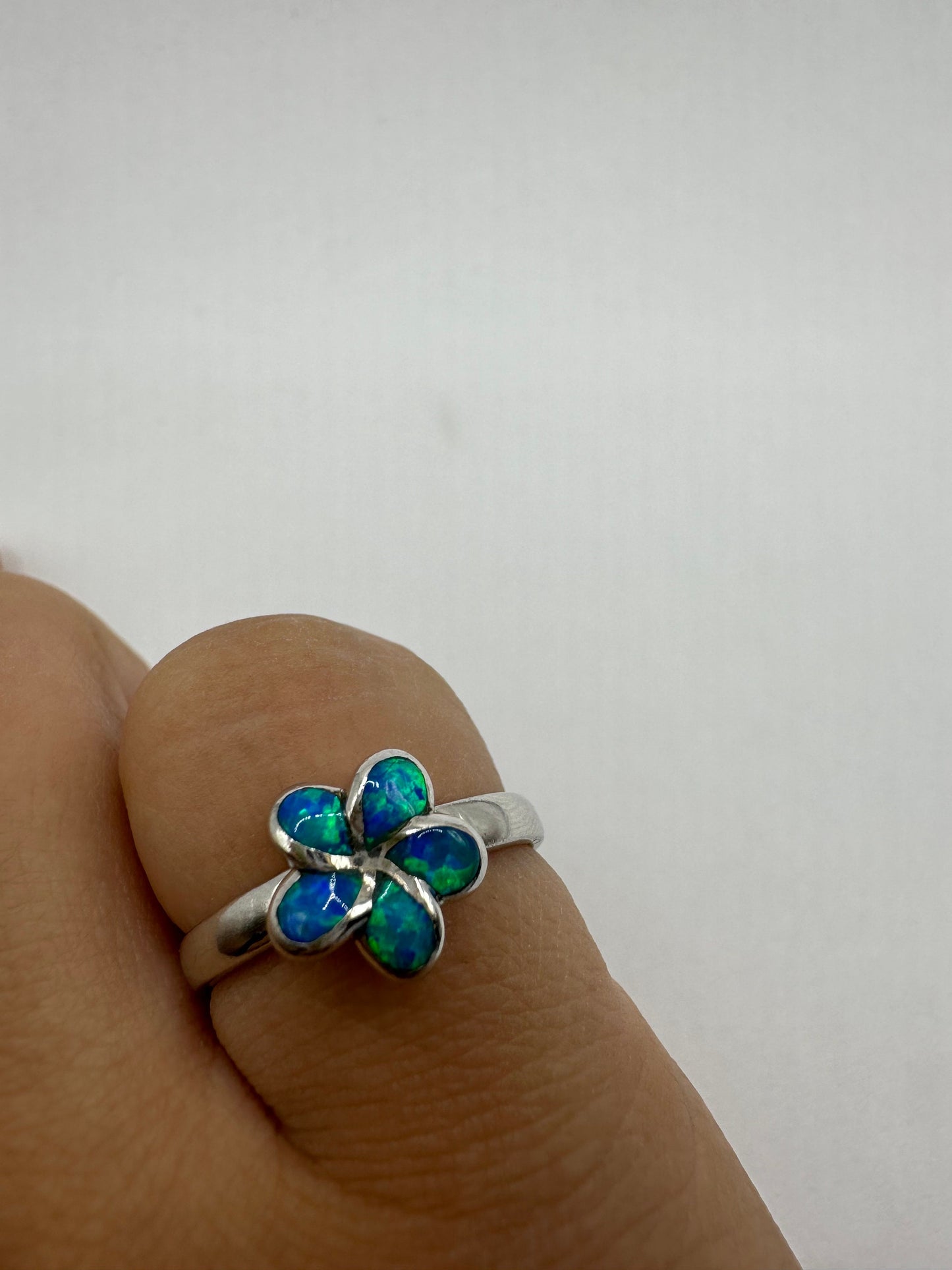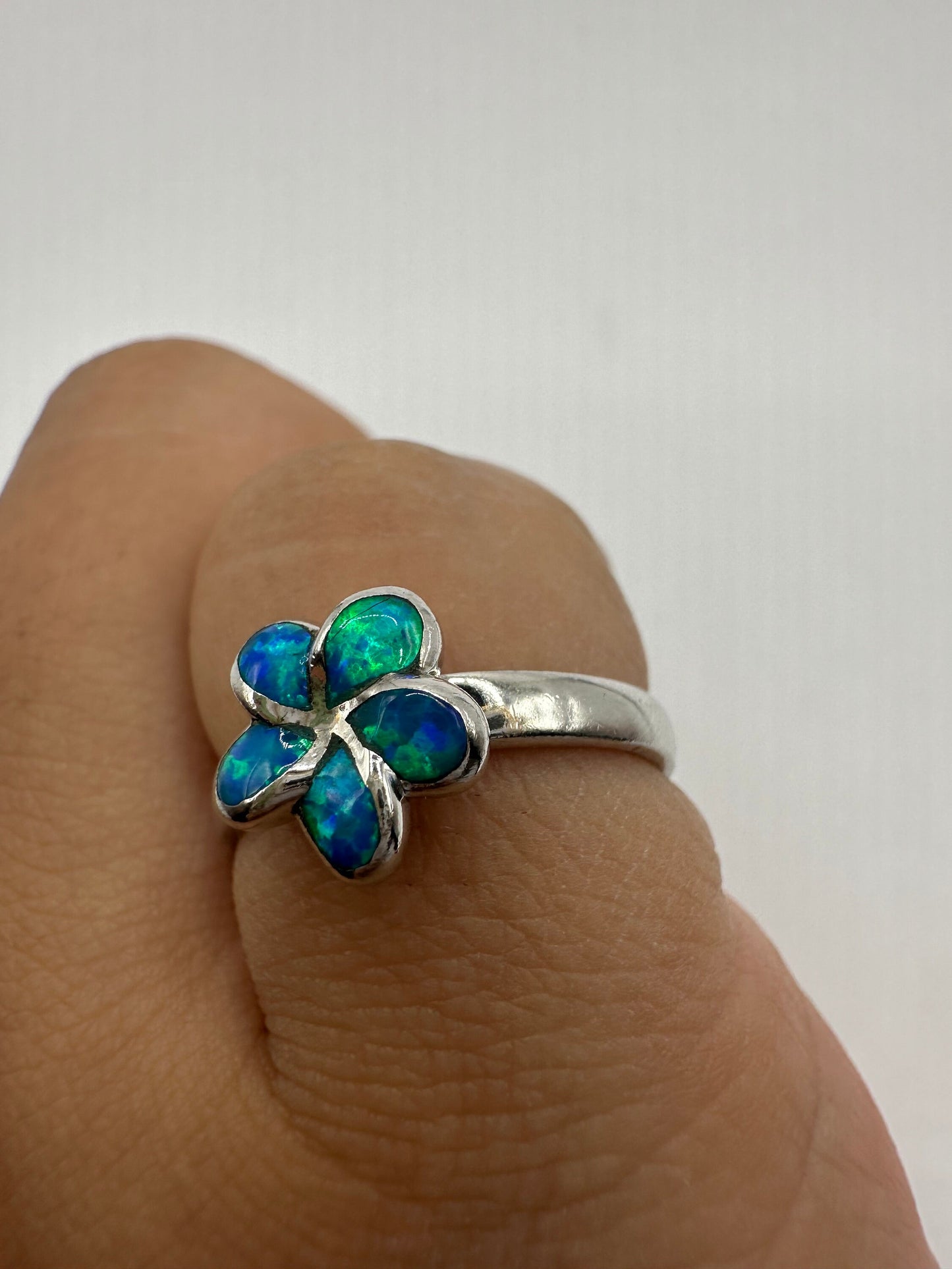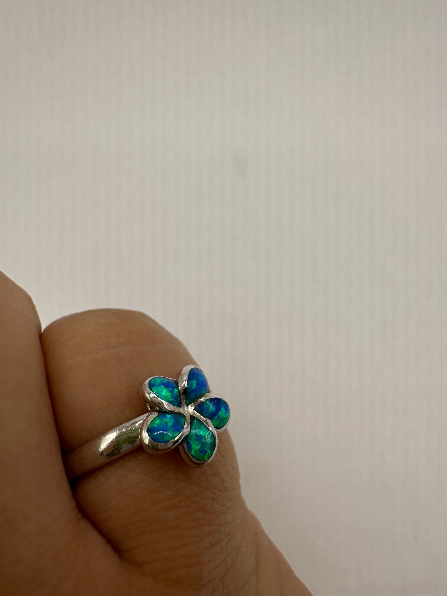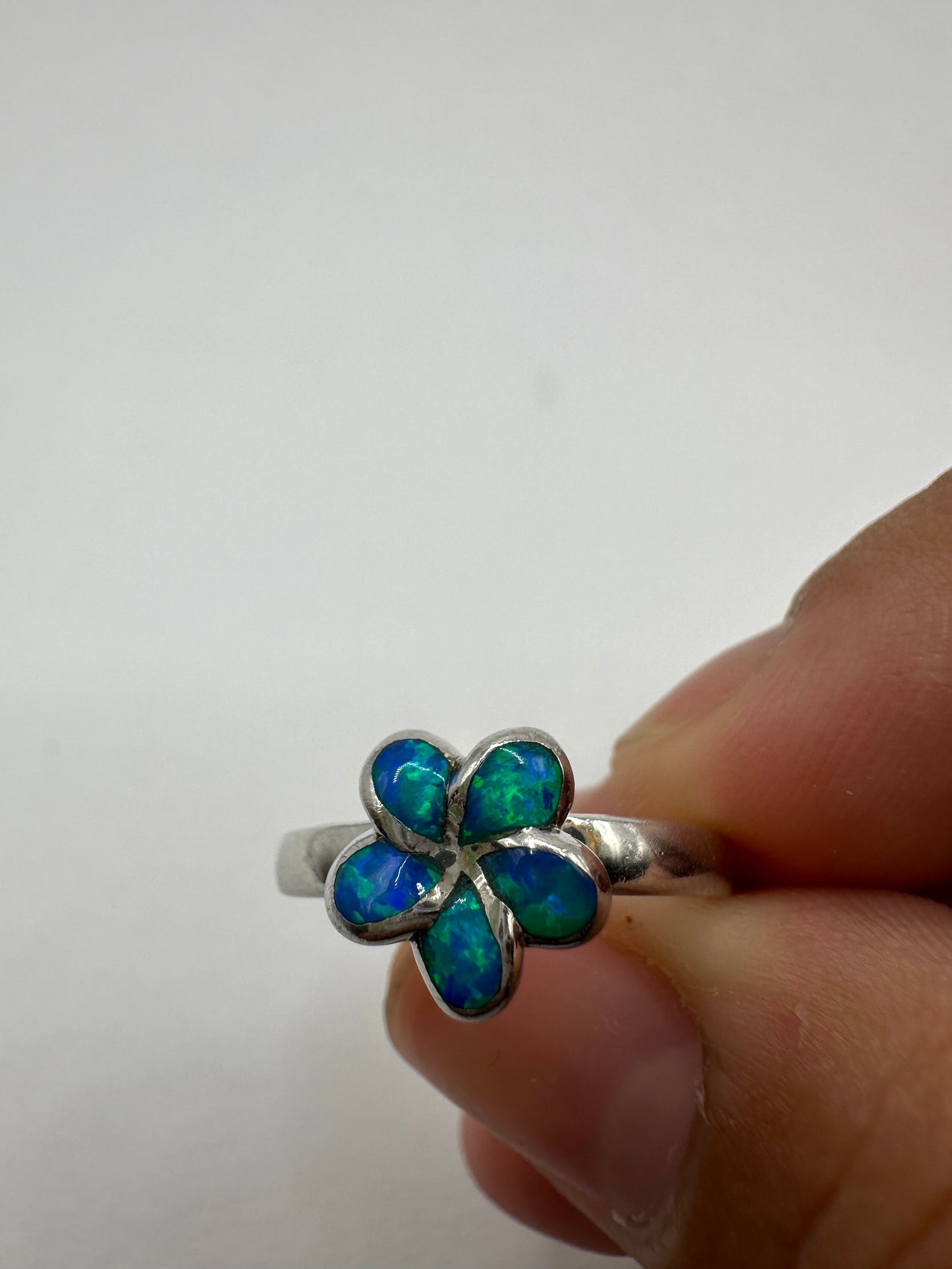 Vintage Genuine Blue Fire Opal Golden 925 Sterling Silver flower Ring