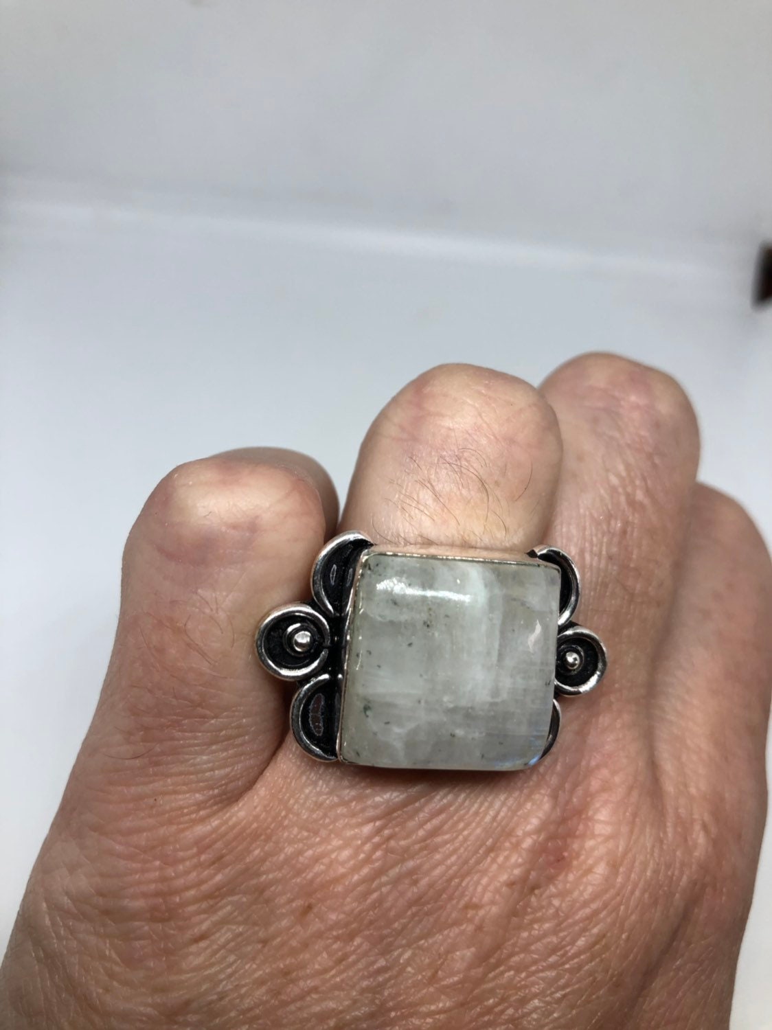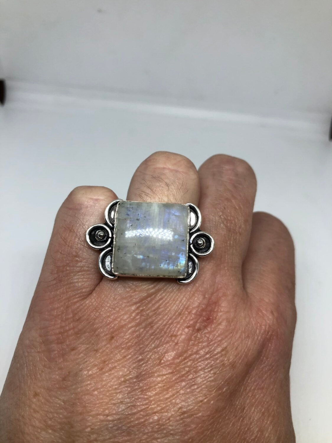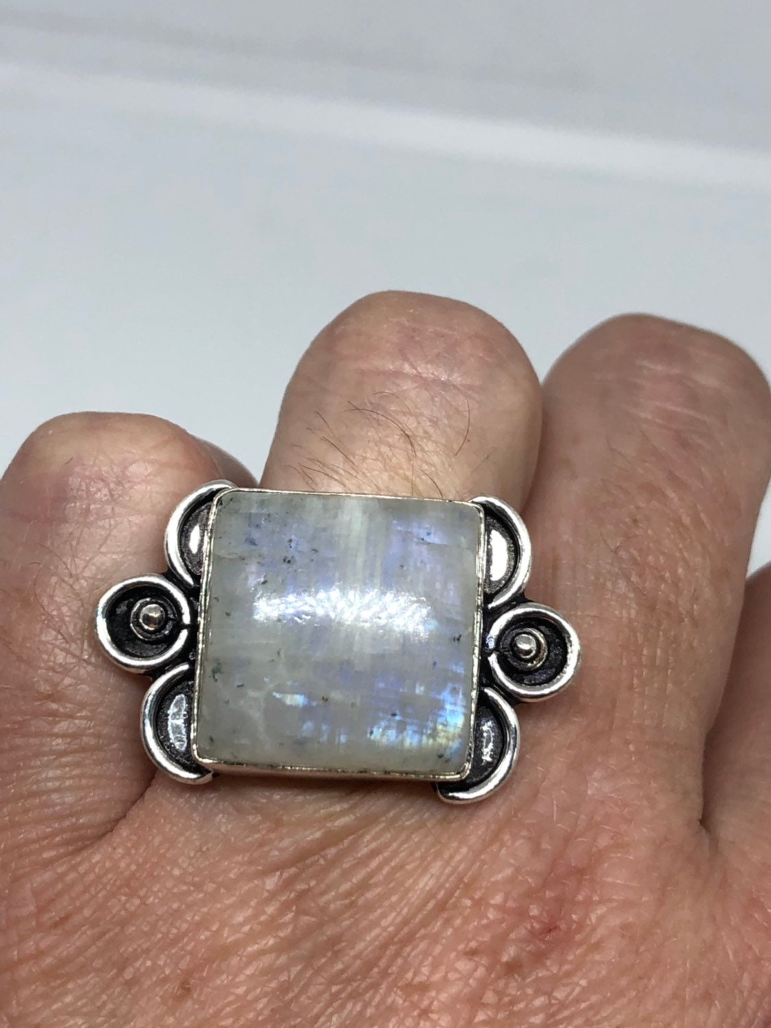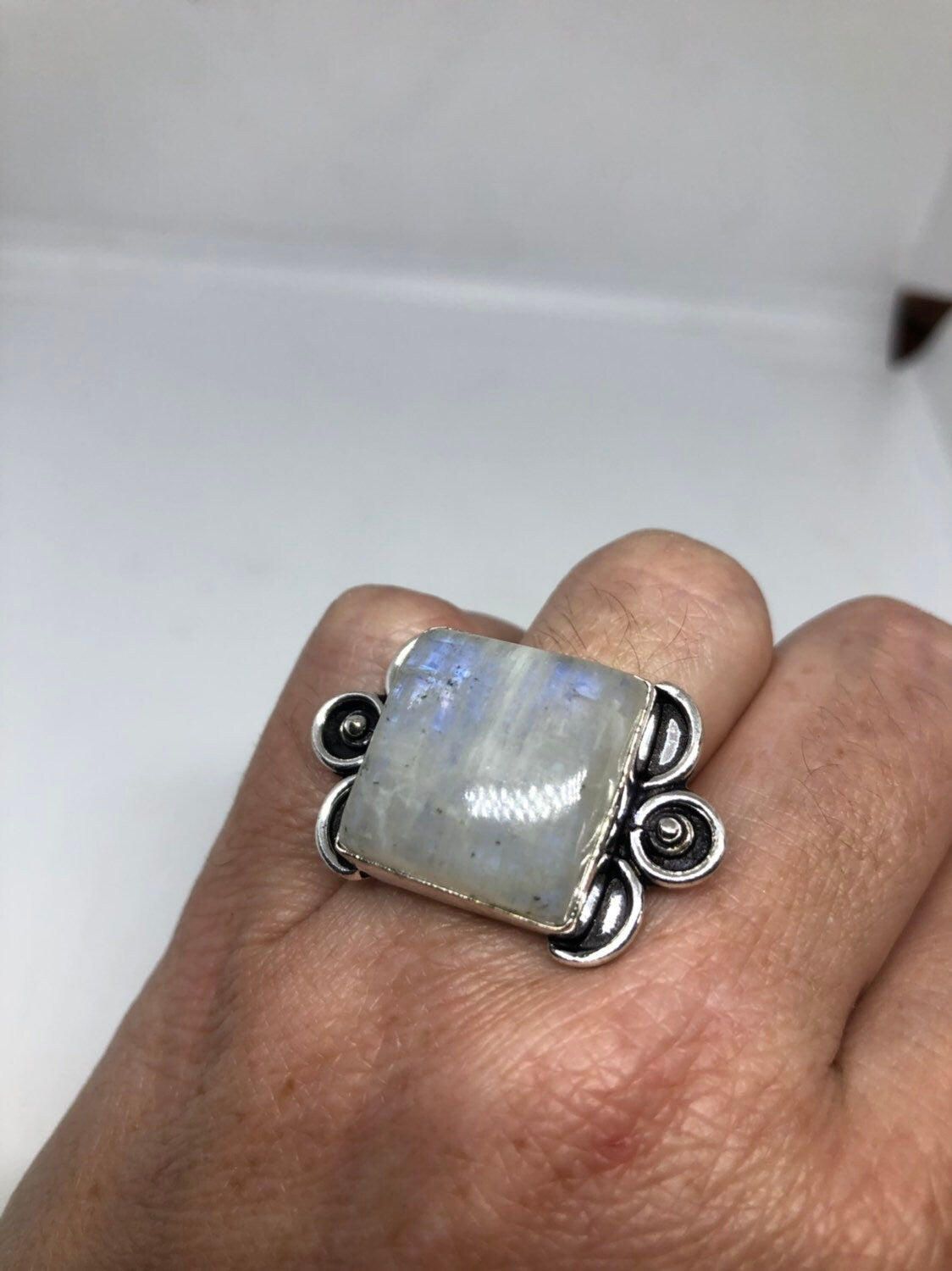 Vintage Genuine Blue White Rainbow Moonstone Ring Statement Cocktail Size 6.75