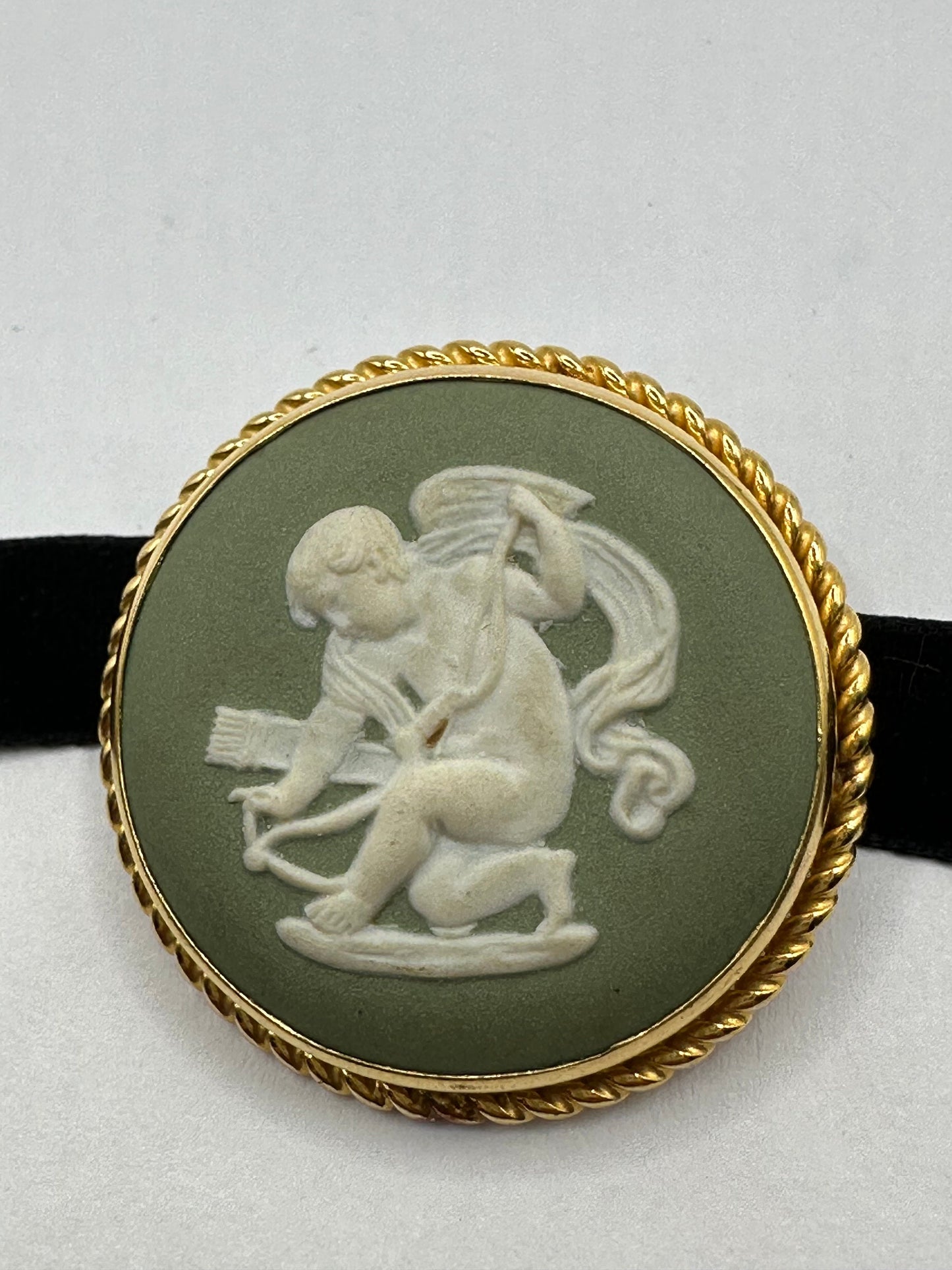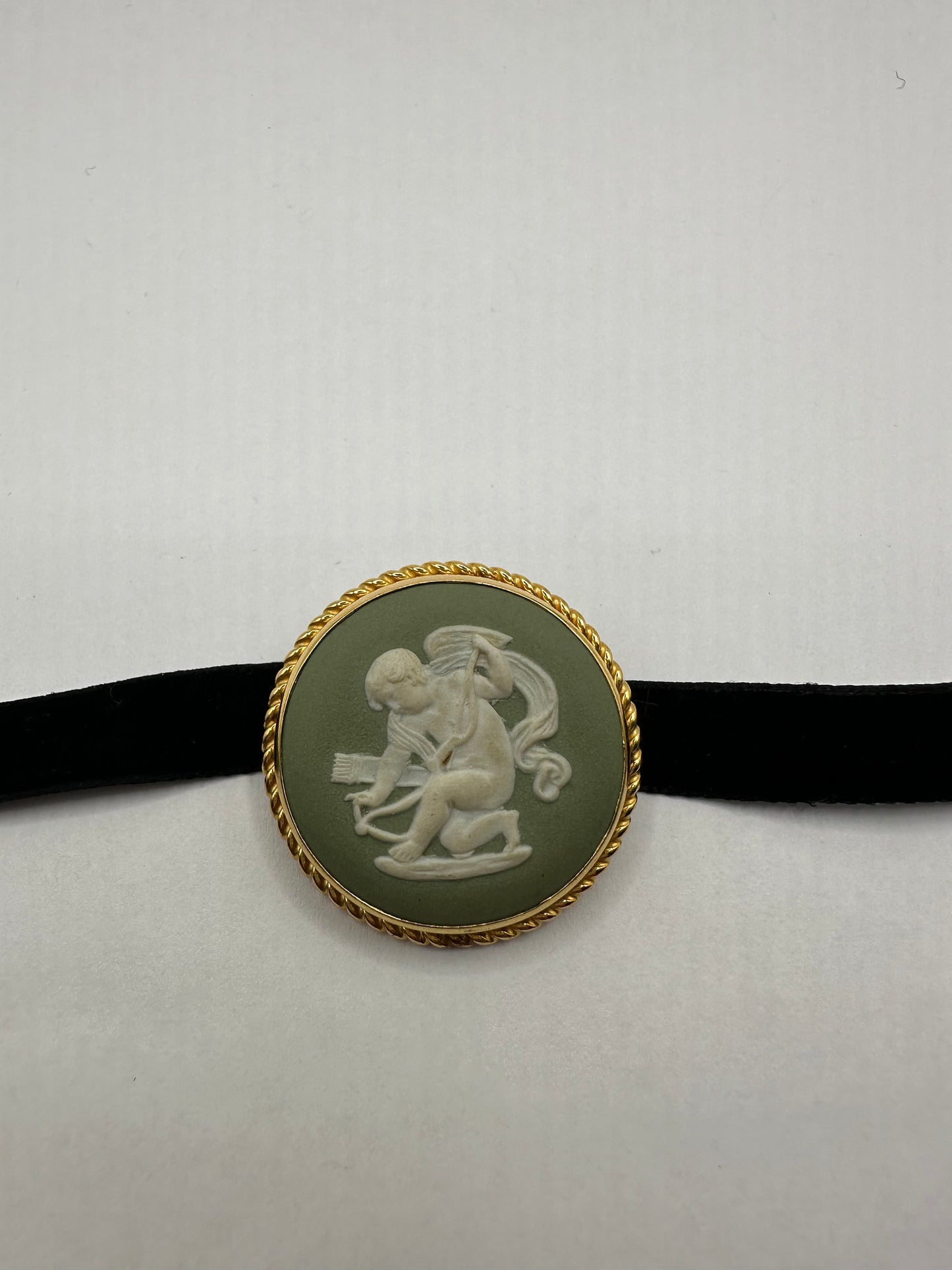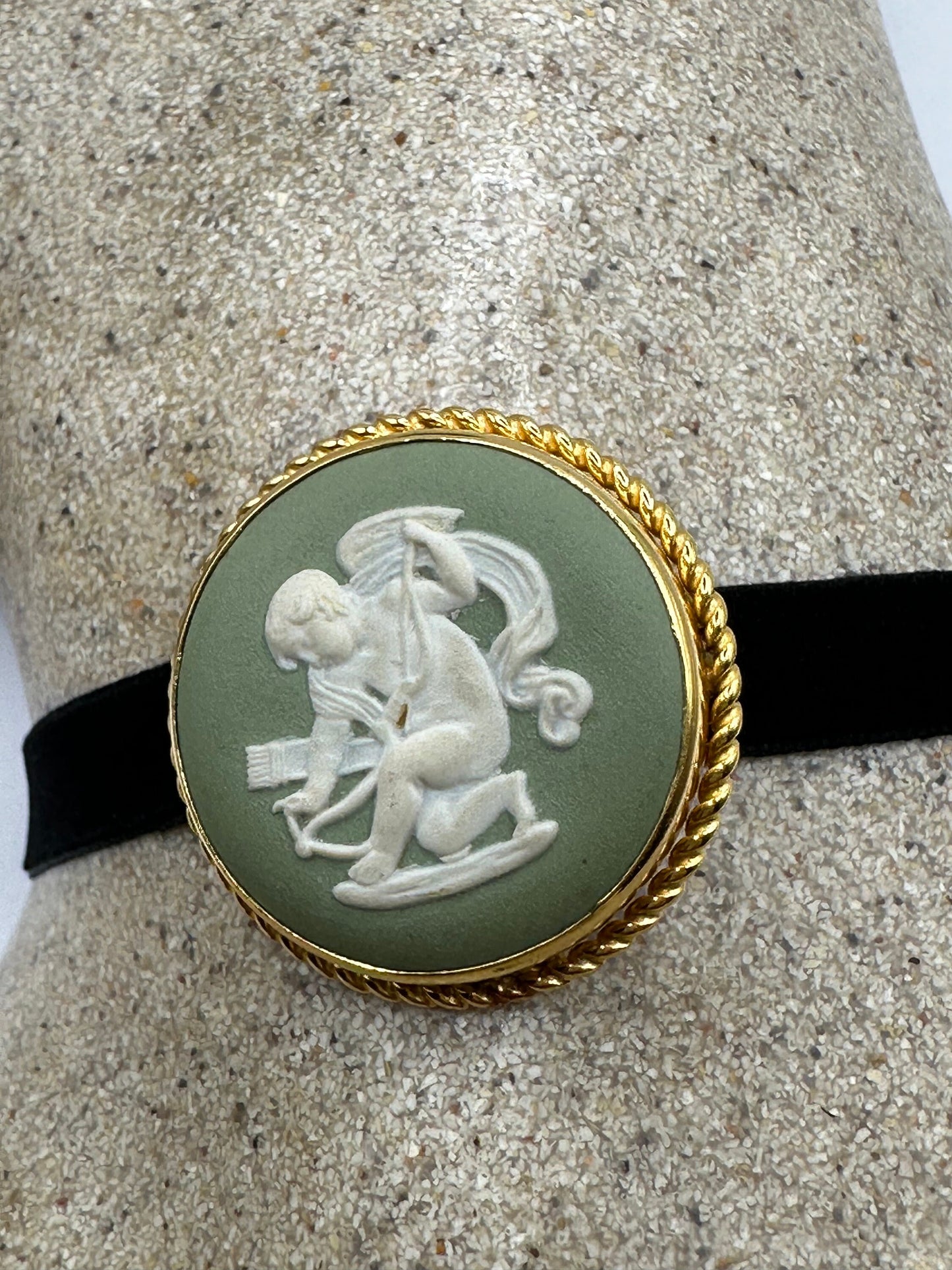 Vintage Genuine Green Wedgewood Porcelian Cameo Gold Filled Necklace Choker pin