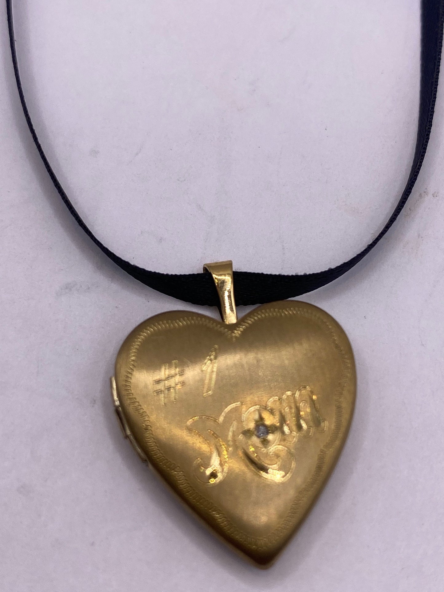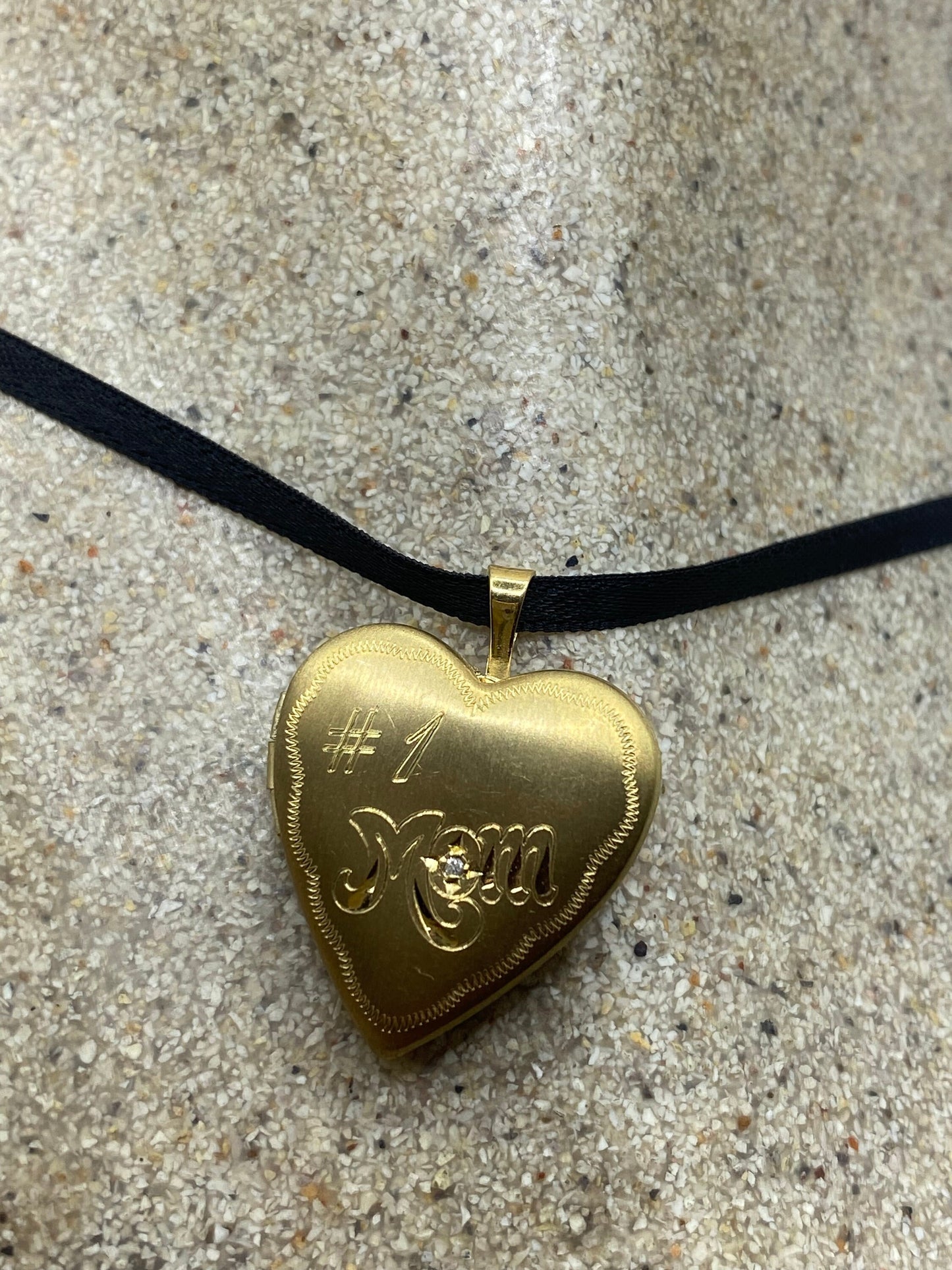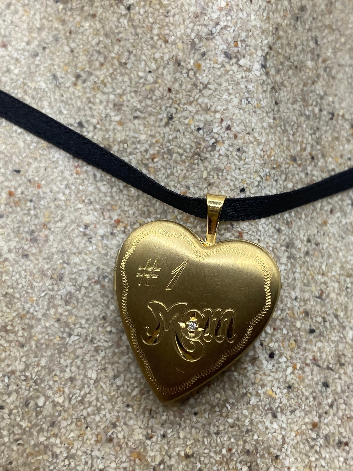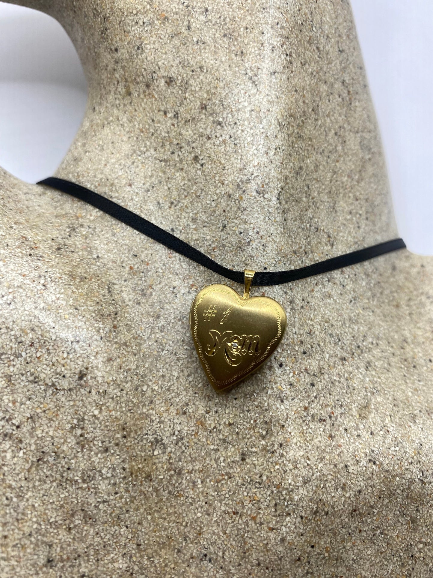 Vintage Gold Locket | Tiny Heart 9k Gold Filled Pendant Photo Memory Charm Engraved #1 Mom | Choker Necklace