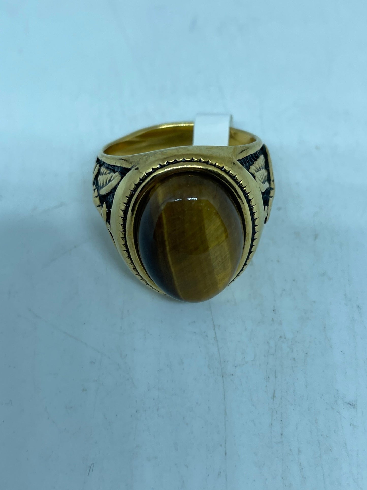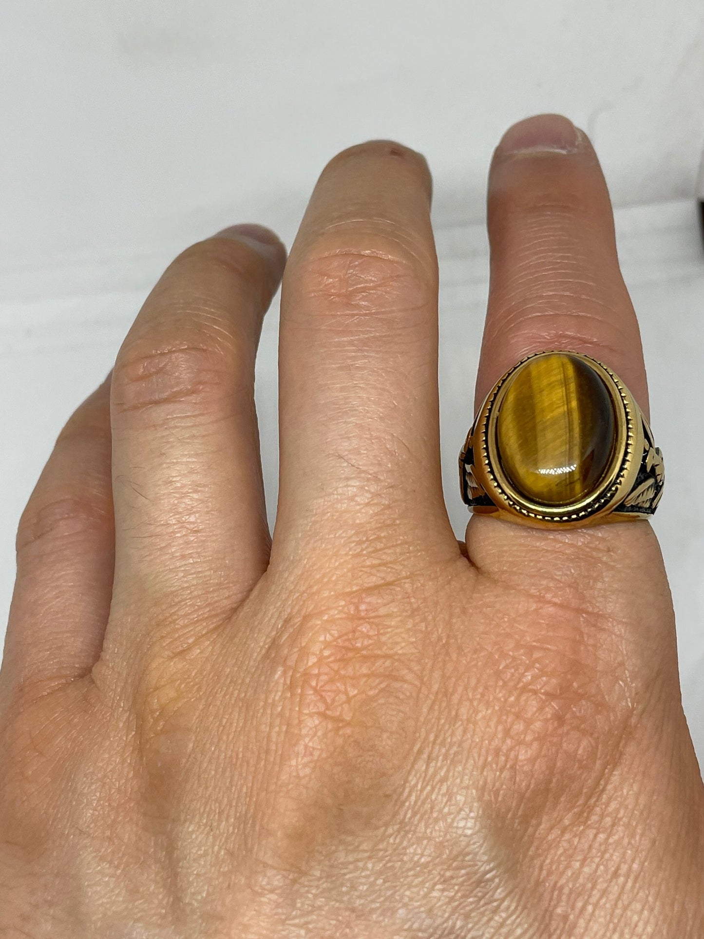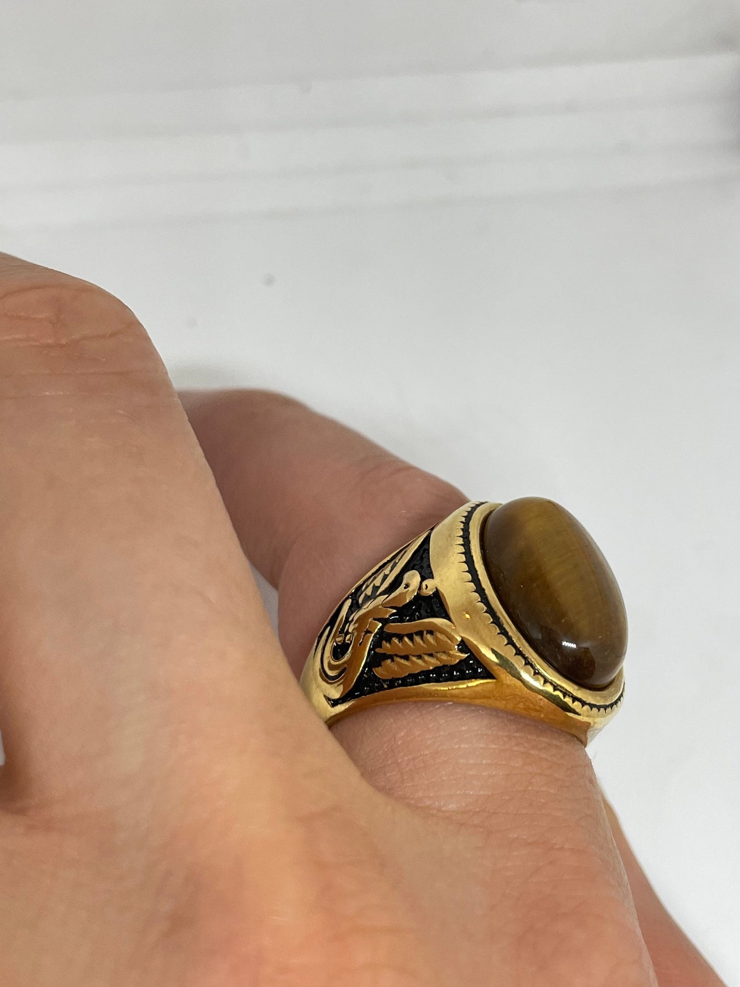 Vintage Gothic Gold Finished Stainless Steel Genuine Tigers Eye Mens Ring
