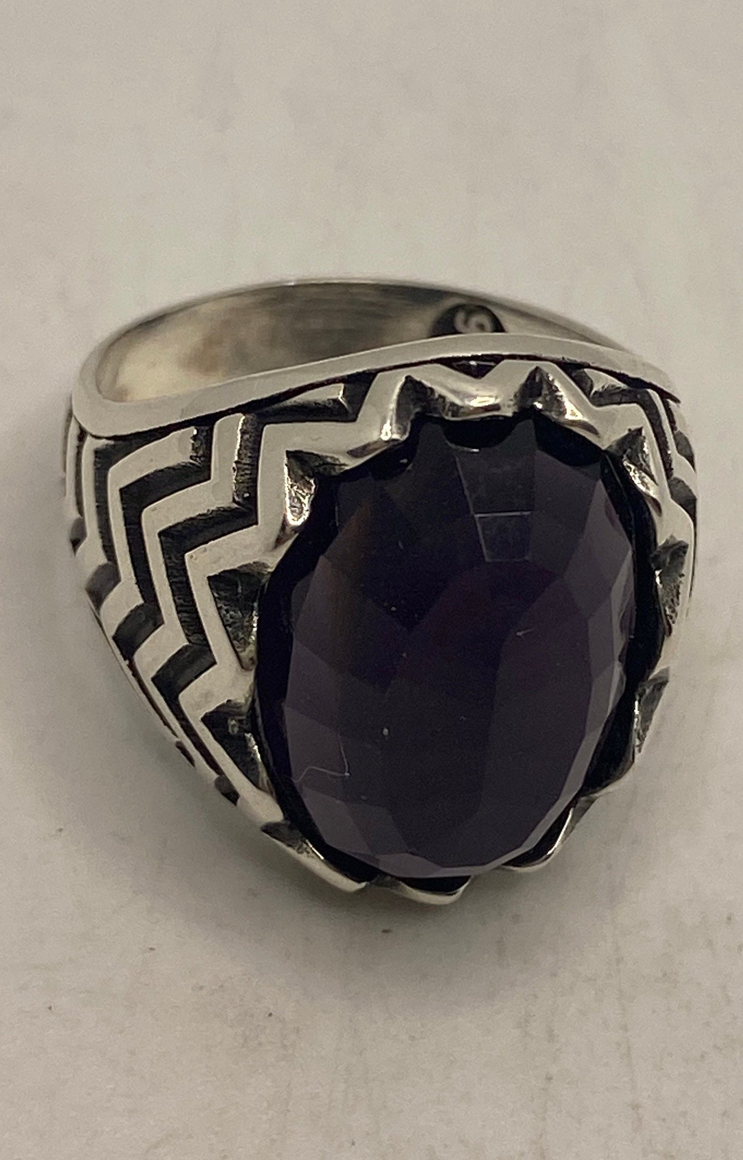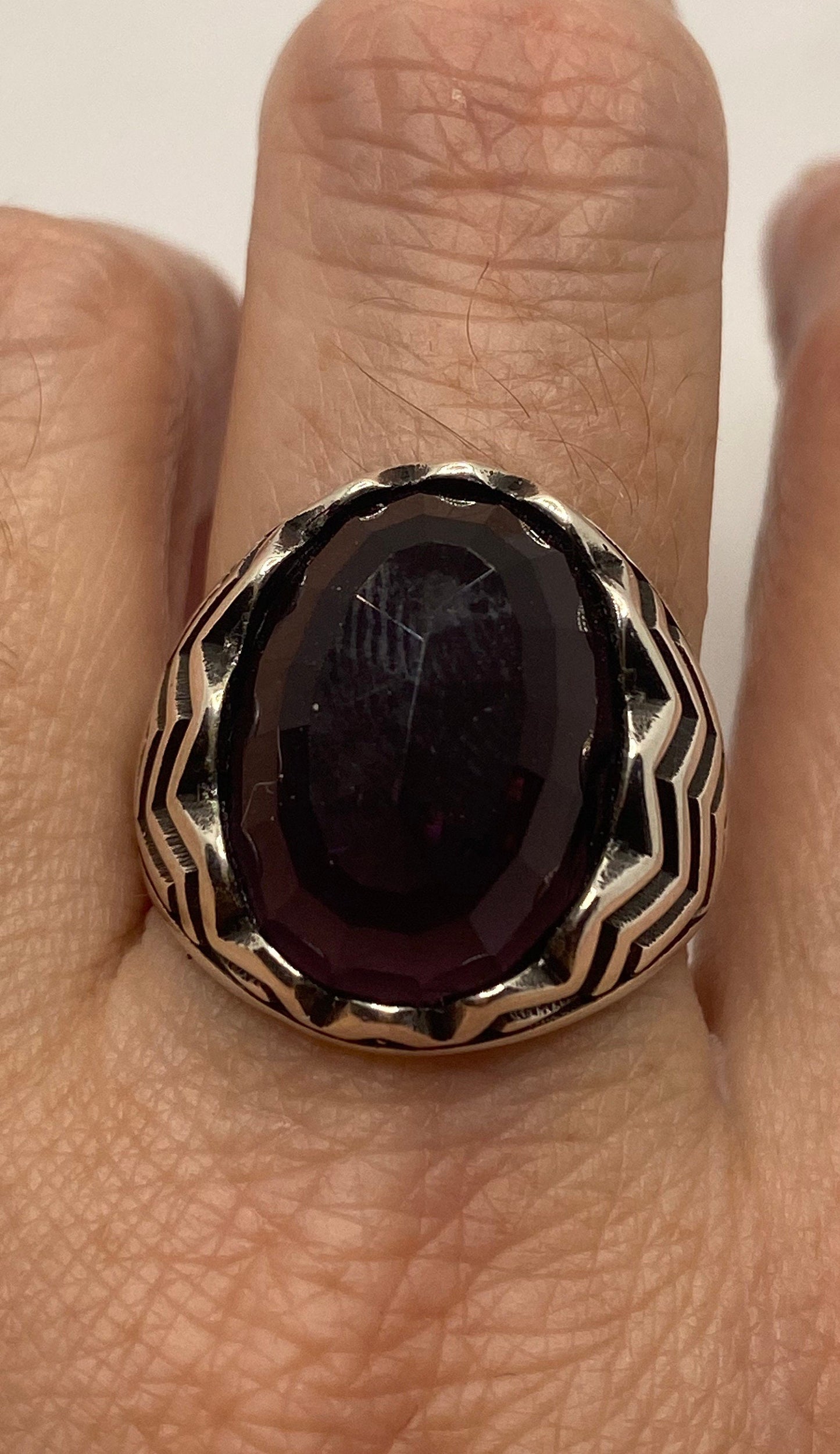 Vintage mens ring 925 sterling silver set with deep purple amethyst glass