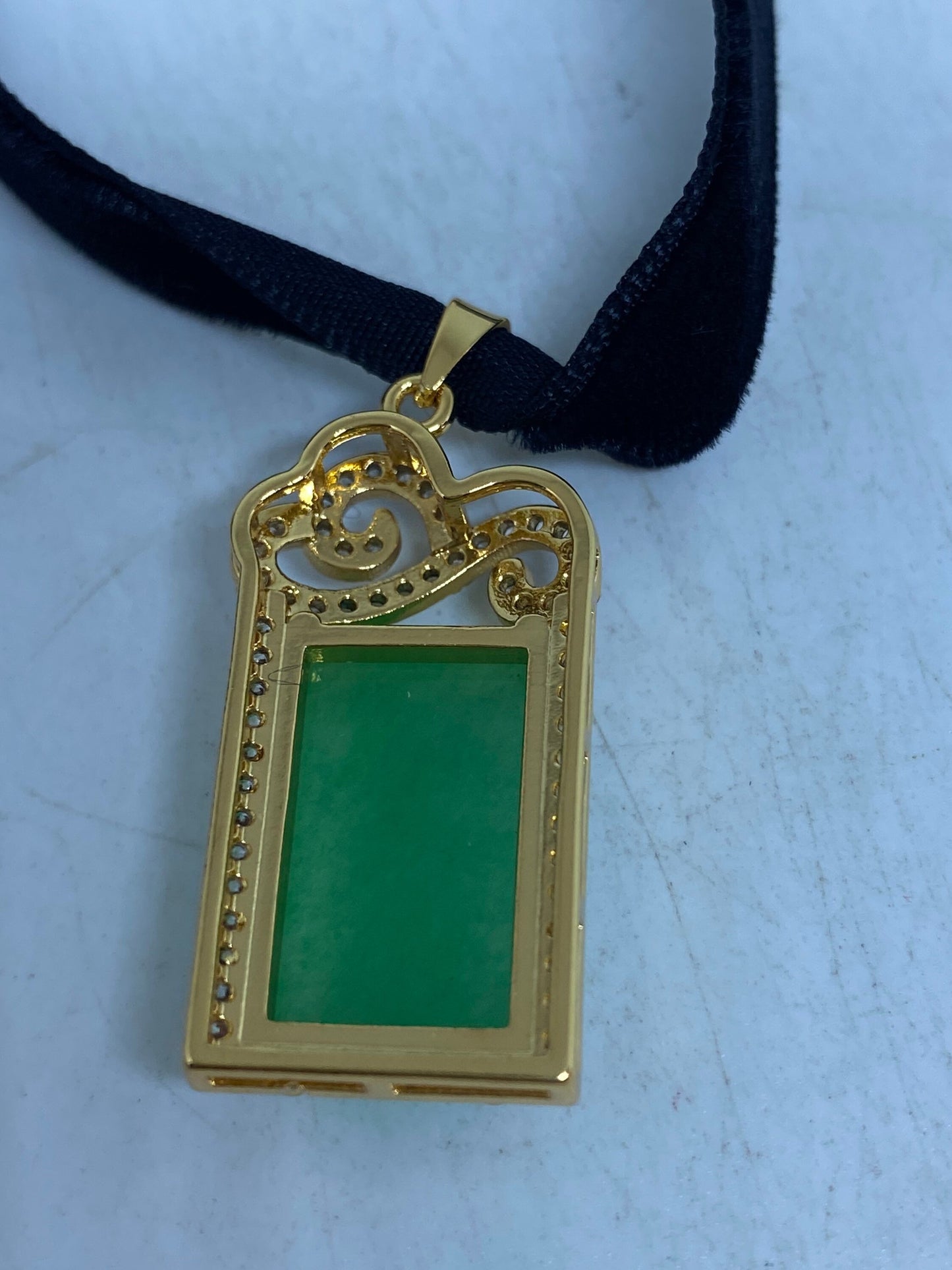 Vintage Green Jade Choker Gold Finish Necklace Pendant