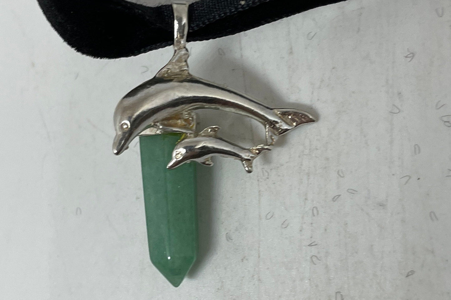 Vintage Jade set in Mother Dolphin and Baby Dolphin Pendant 925 Sterling Silver Setting