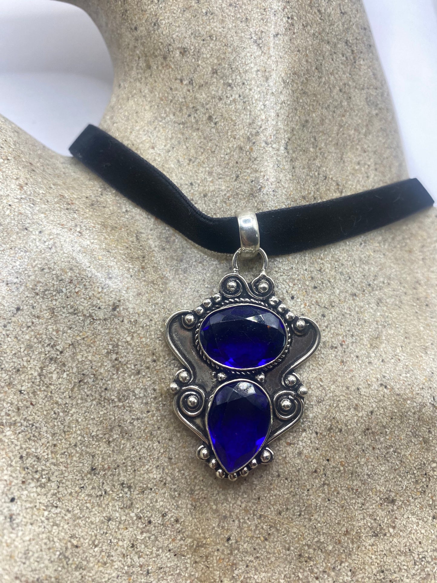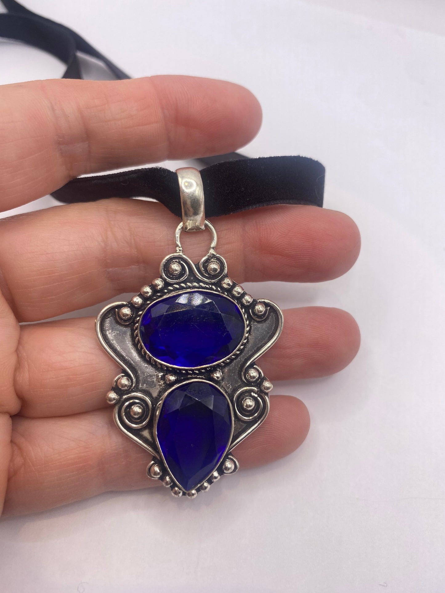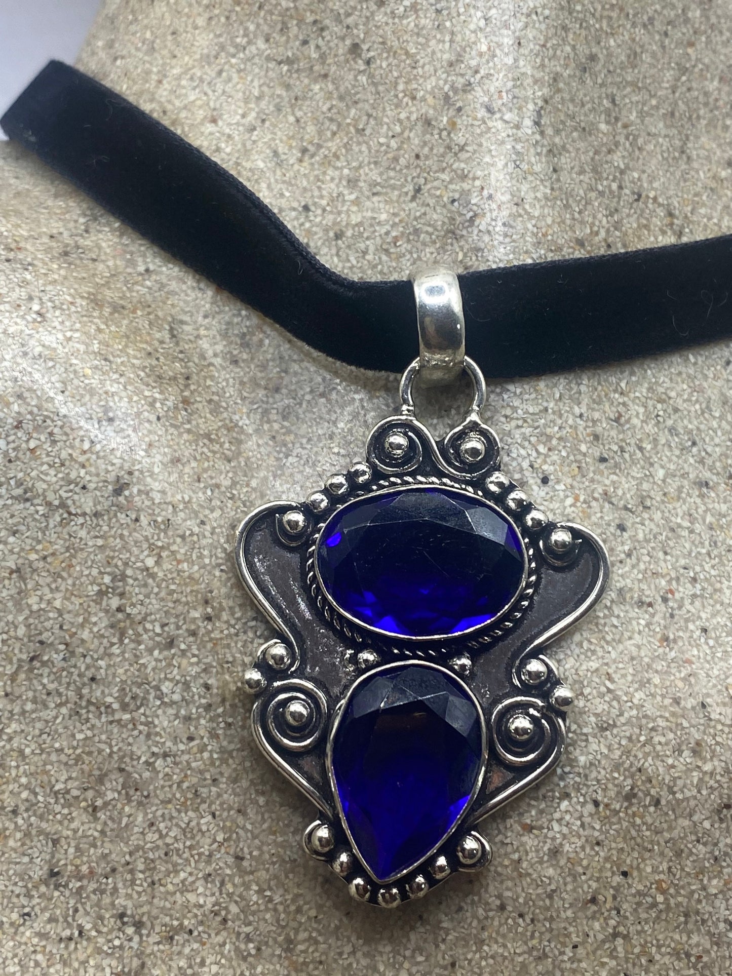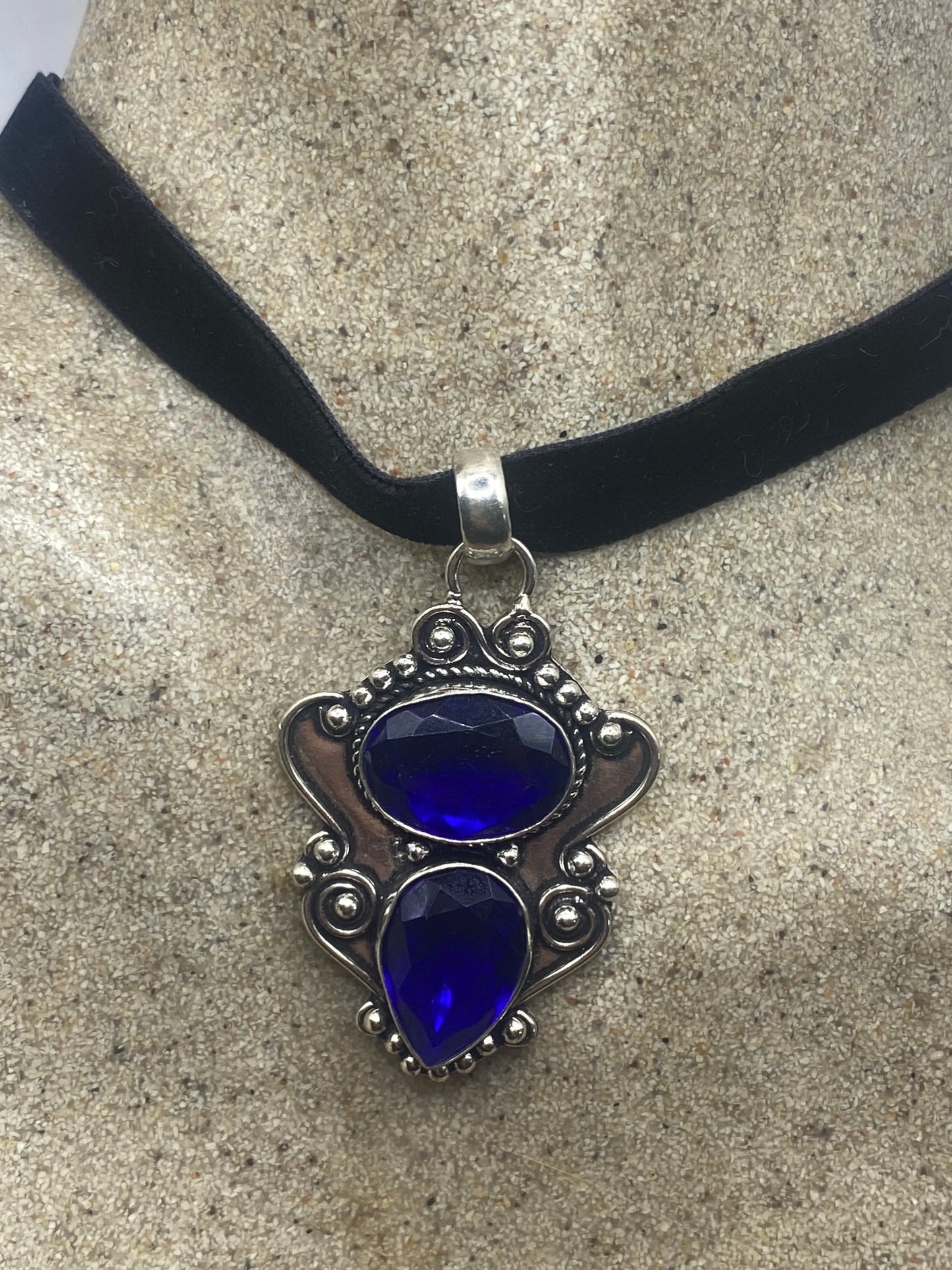 Vintage Indigo Blue Glass Black Velvet Choker Necklace