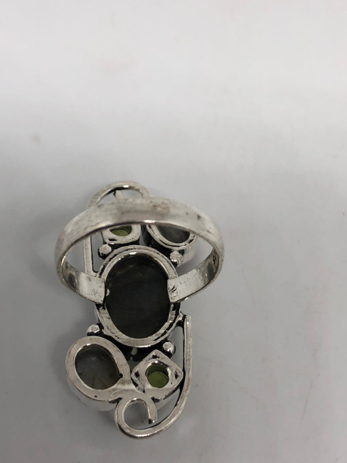 Vintage Large Blue Green Labradorite and Peridot Stone Silver Ring