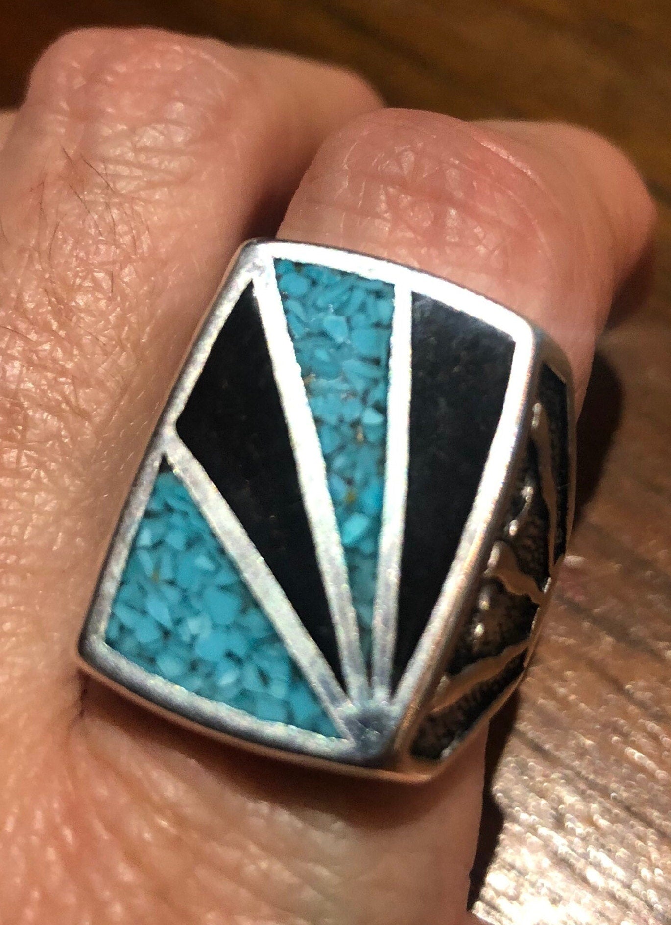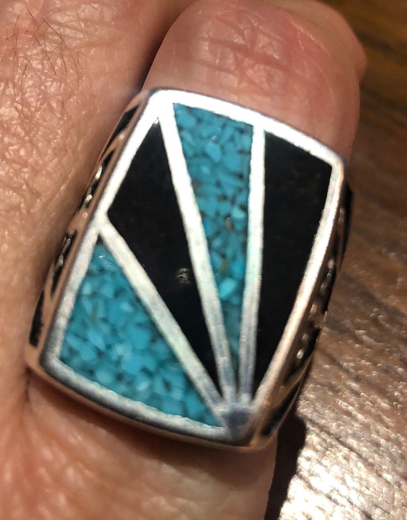 Vintage Native American Style Southwestern Turquoise Stone Inlay Mens Ring