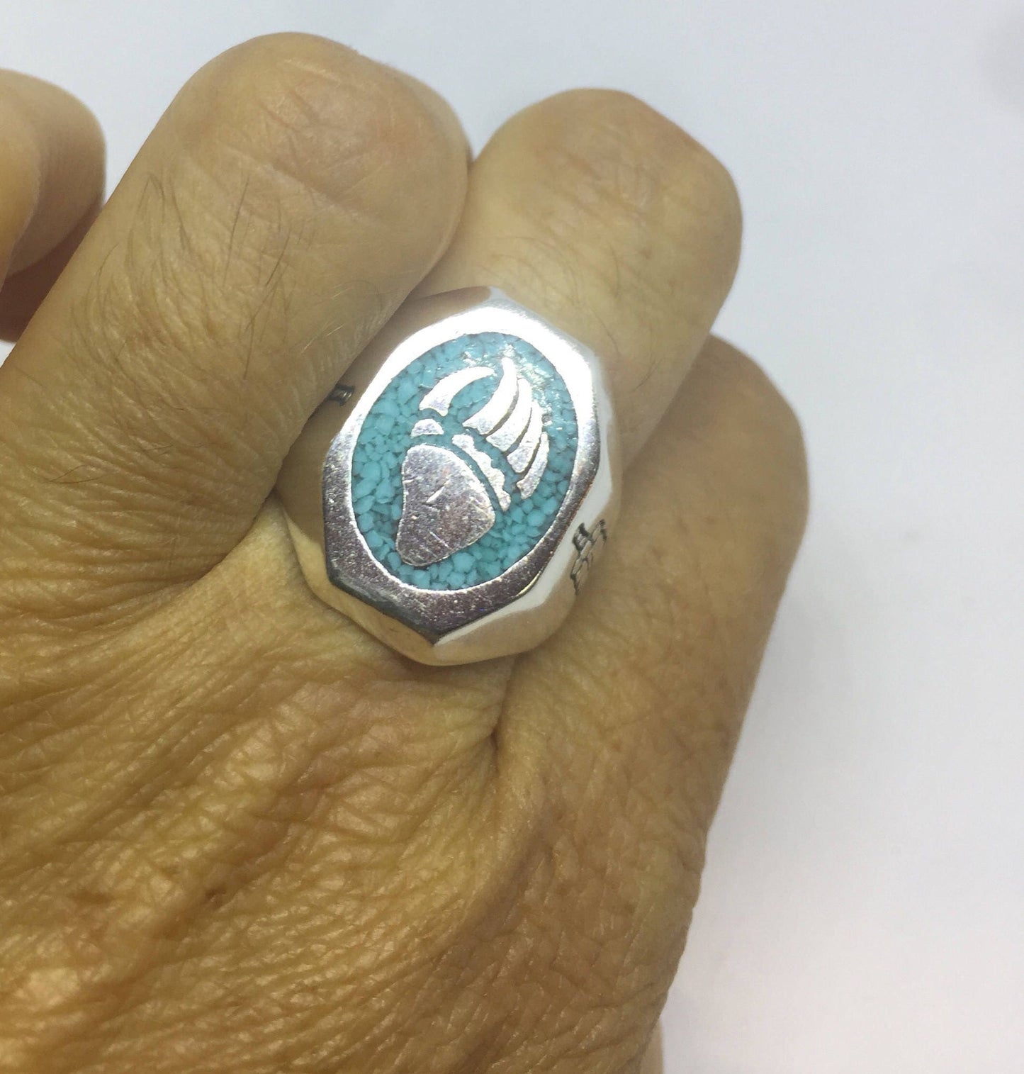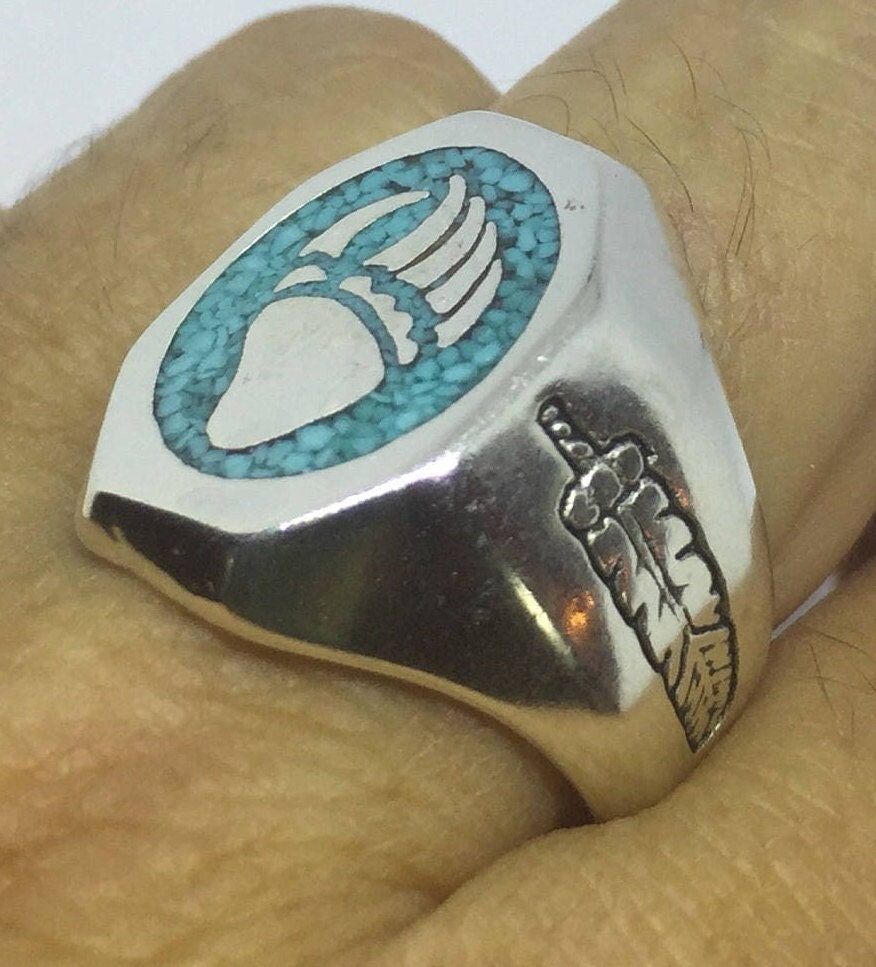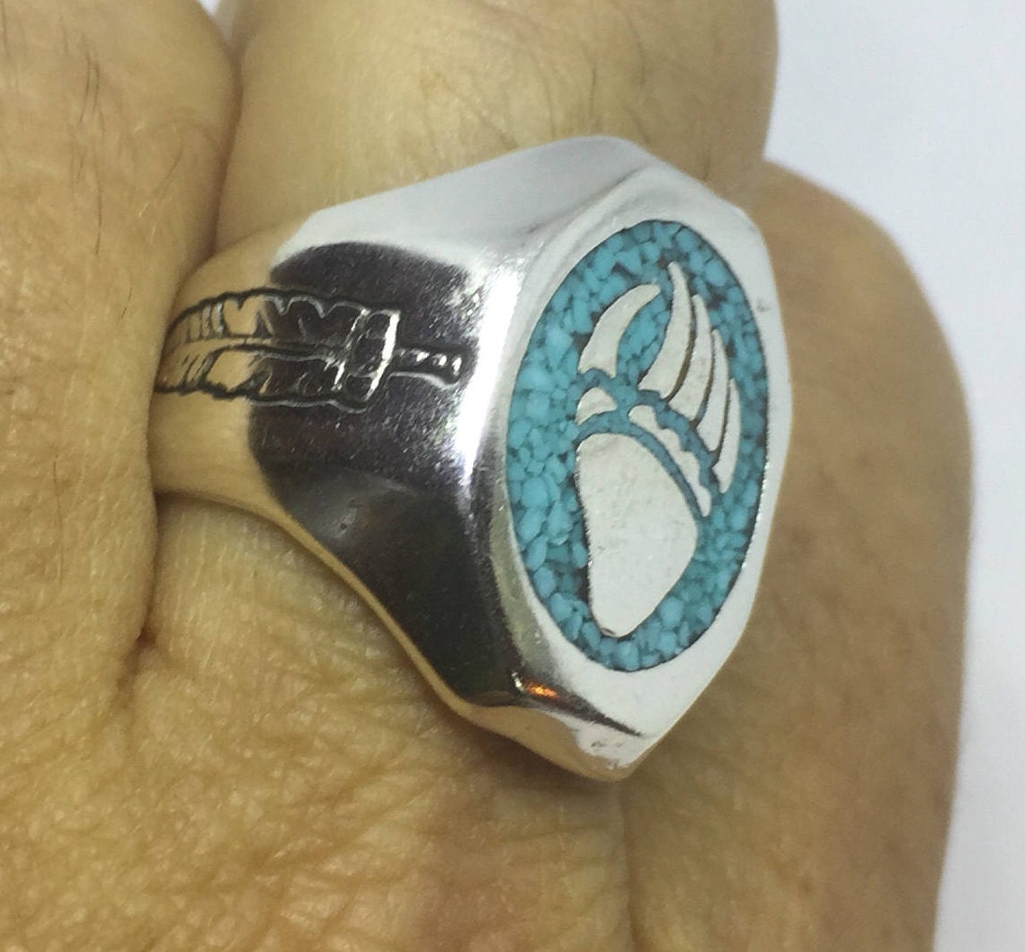 Vintage Native American Style Southwestern Turquoise Stone Inlay Mens Bear Paw Ring