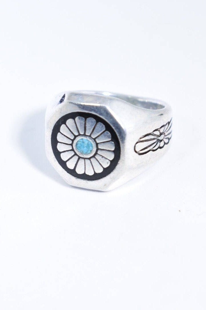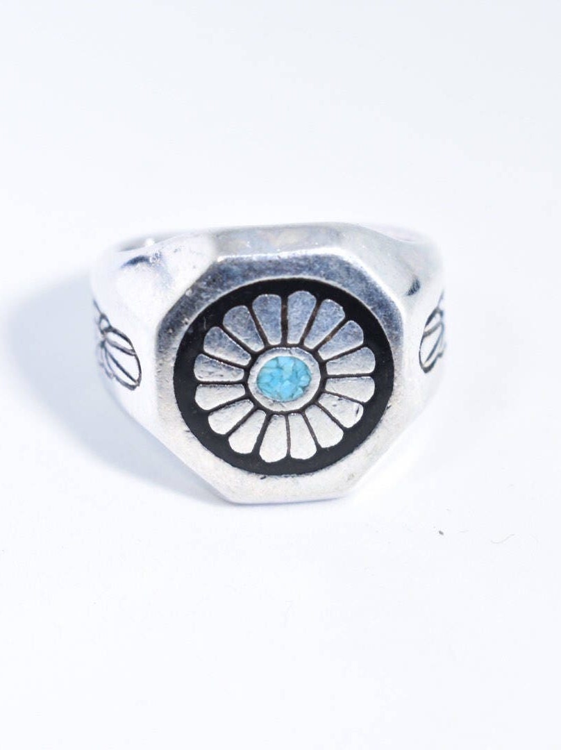 Vintage Native American Style Southwestern Turquoise Stone Inlay Mens Chrysanthemum Ring