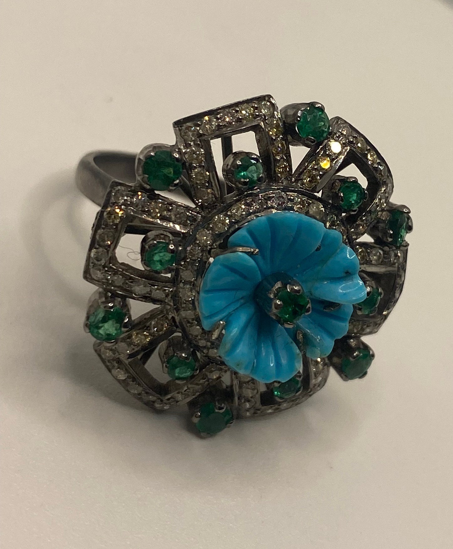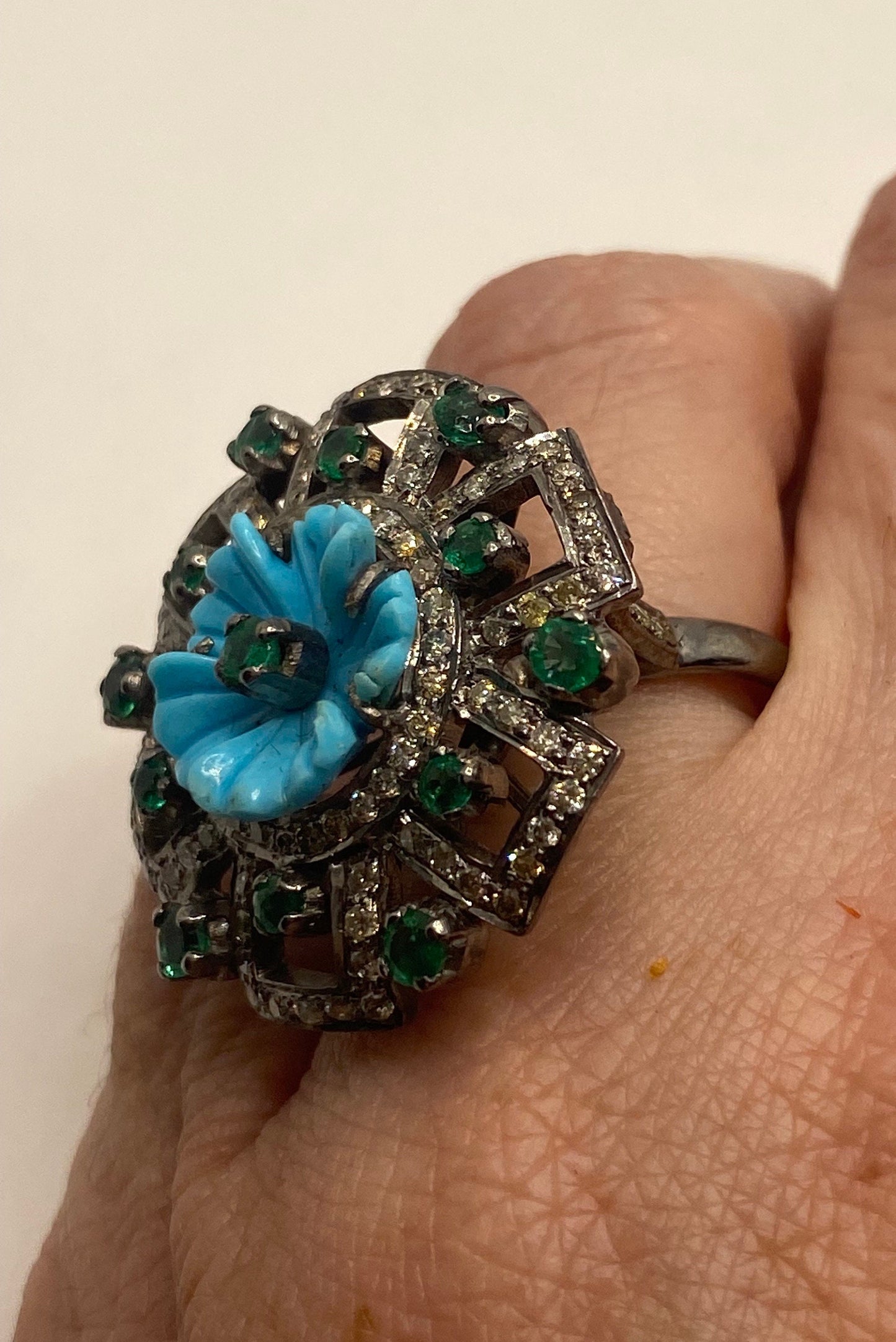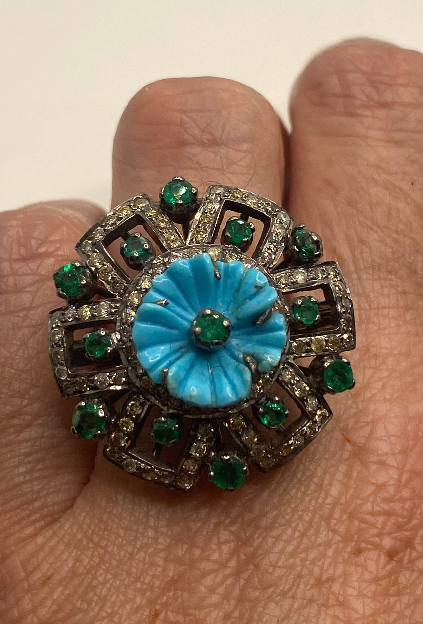 Vintage Persian turquoise flower campaign diamond and genuine emerald cocktail ring 925 sterling silver size 7