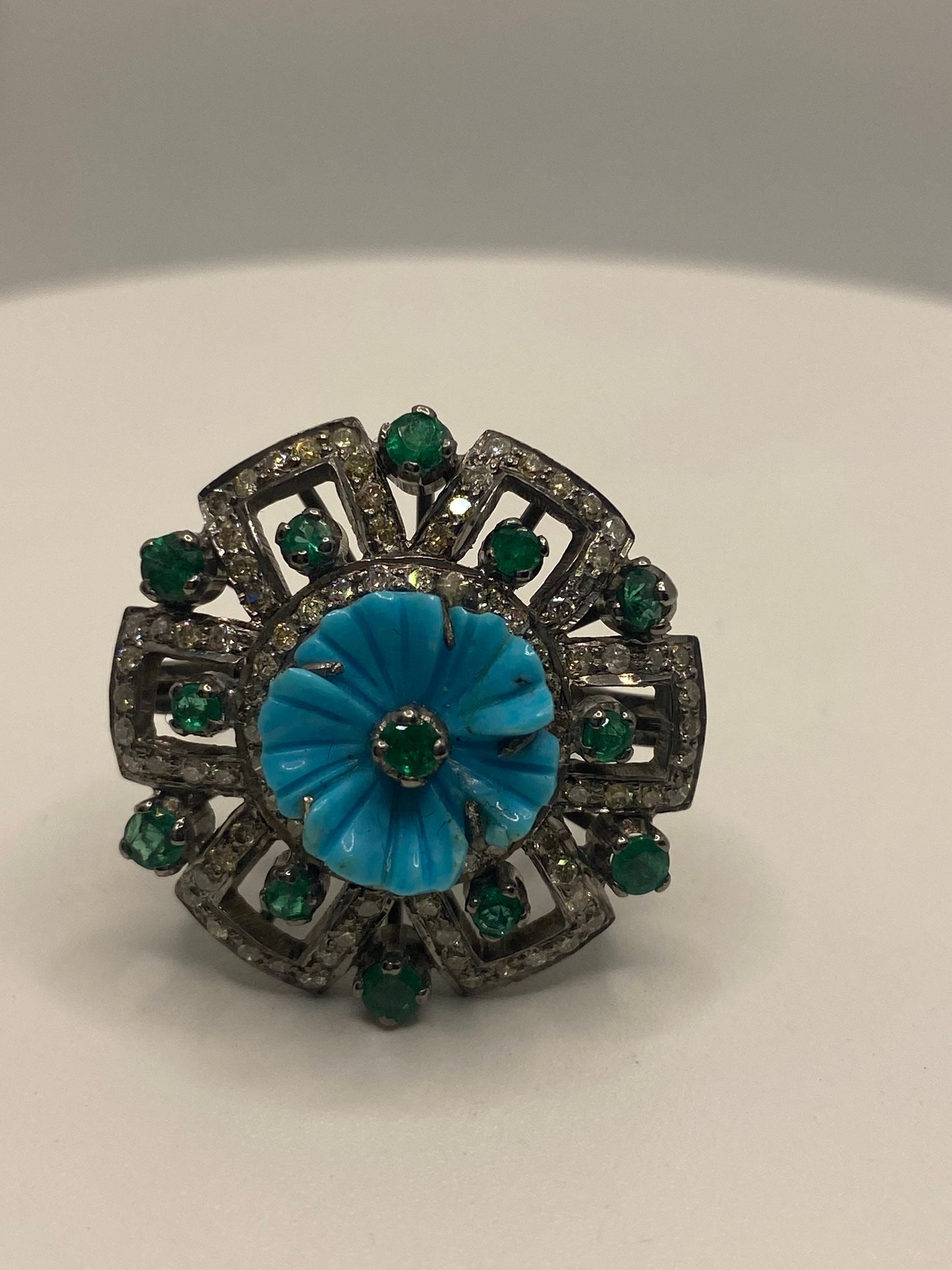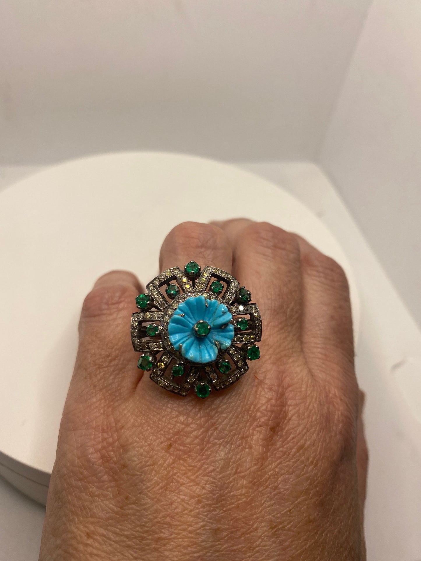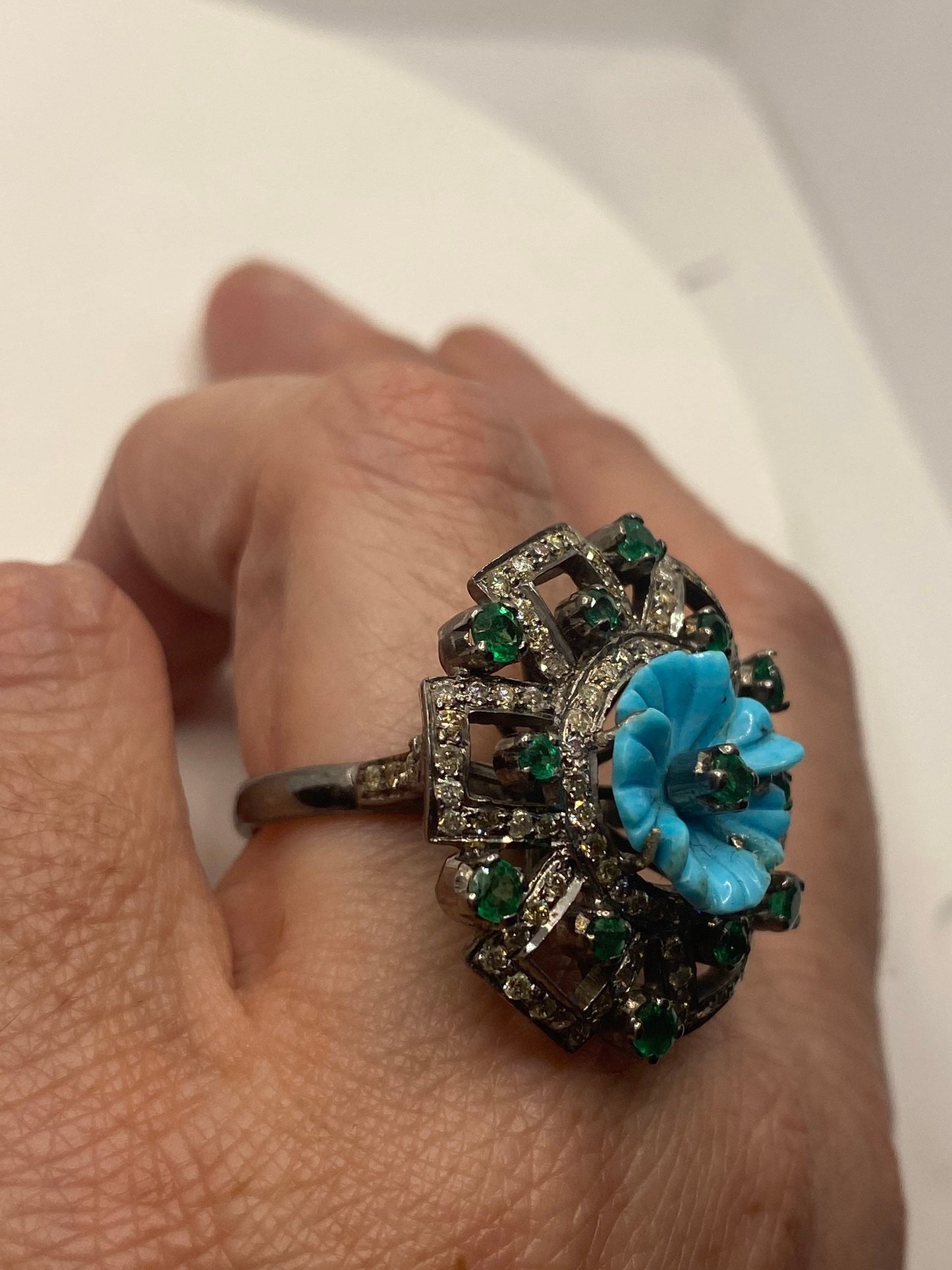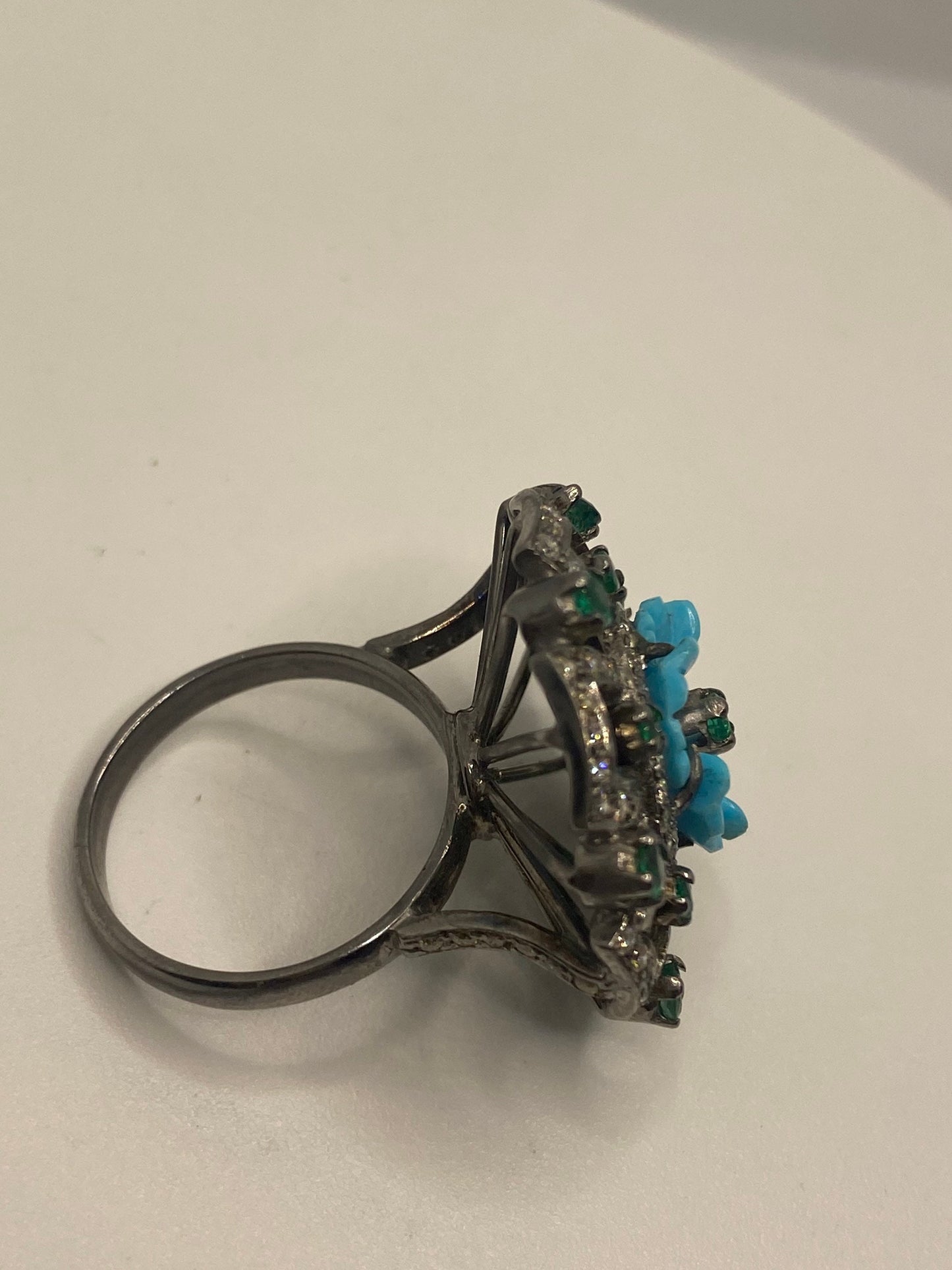 Vintage Persian turquoise flower campaign diamond and genuine emerald cocktail ring 925 sterling silver size 7