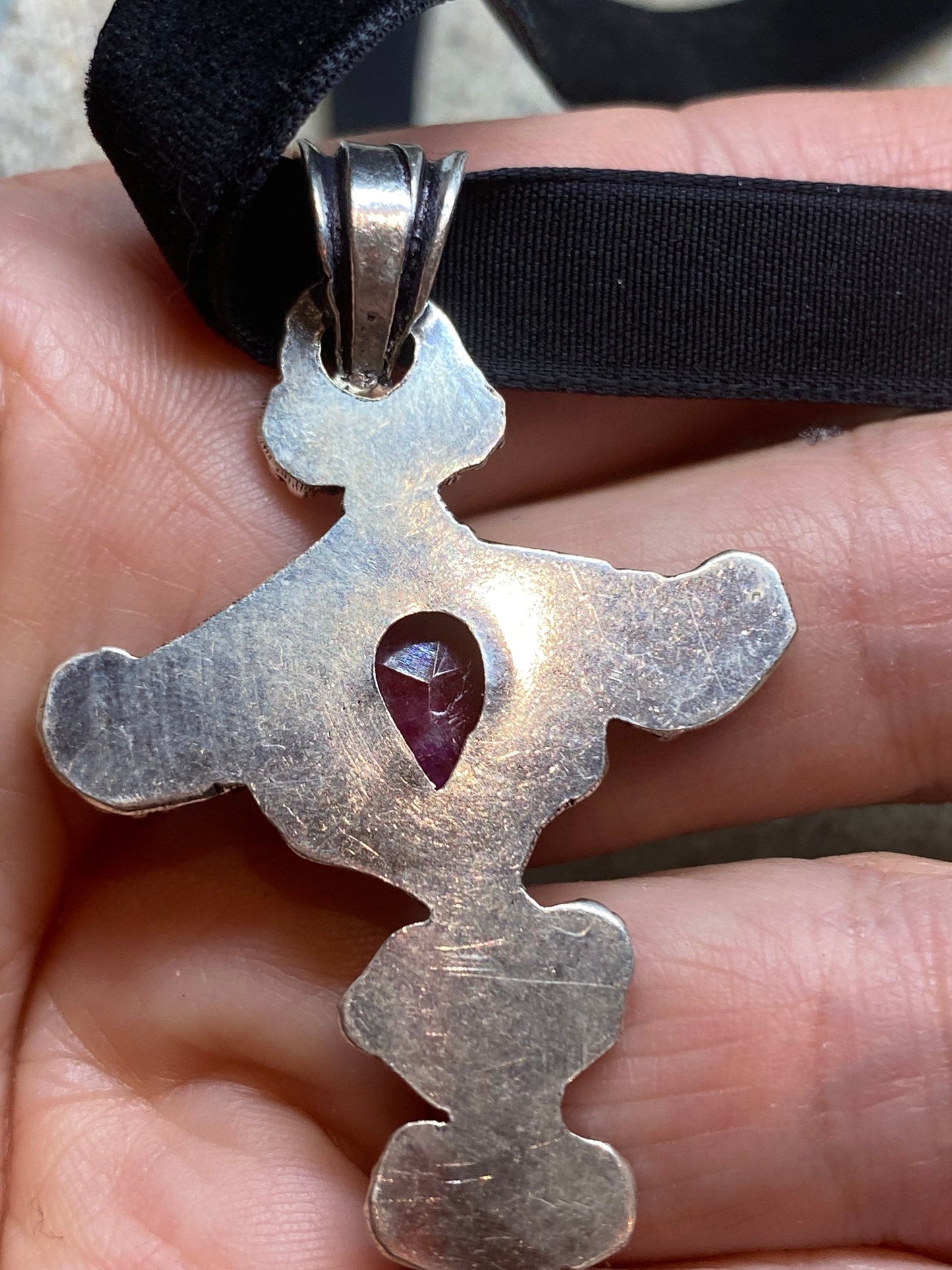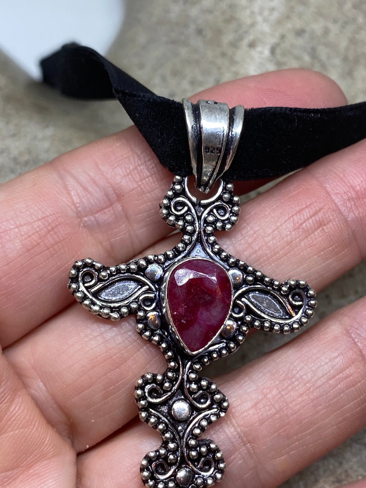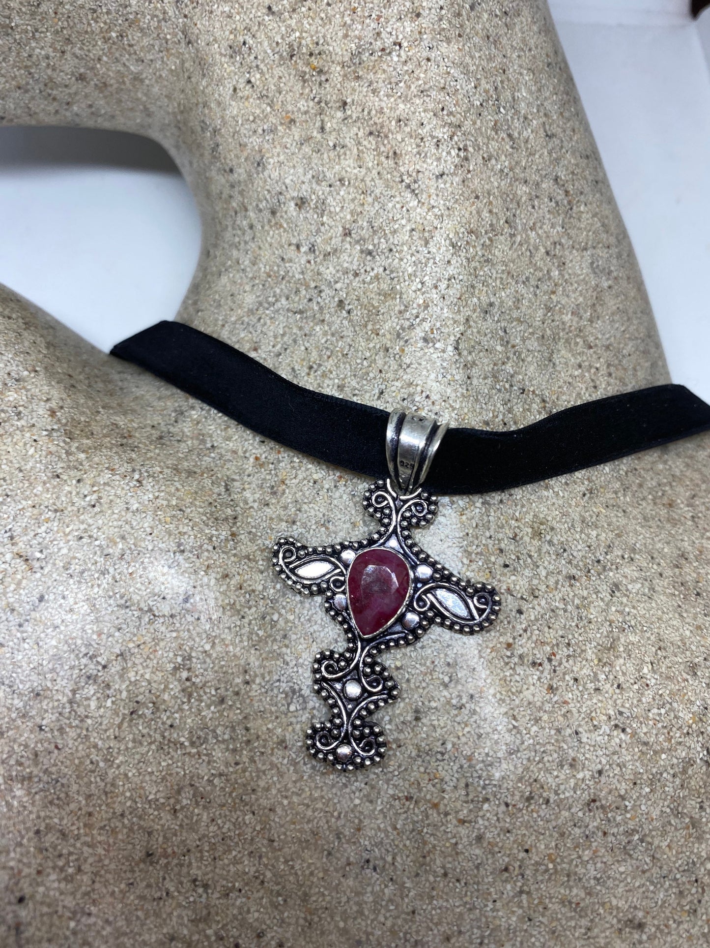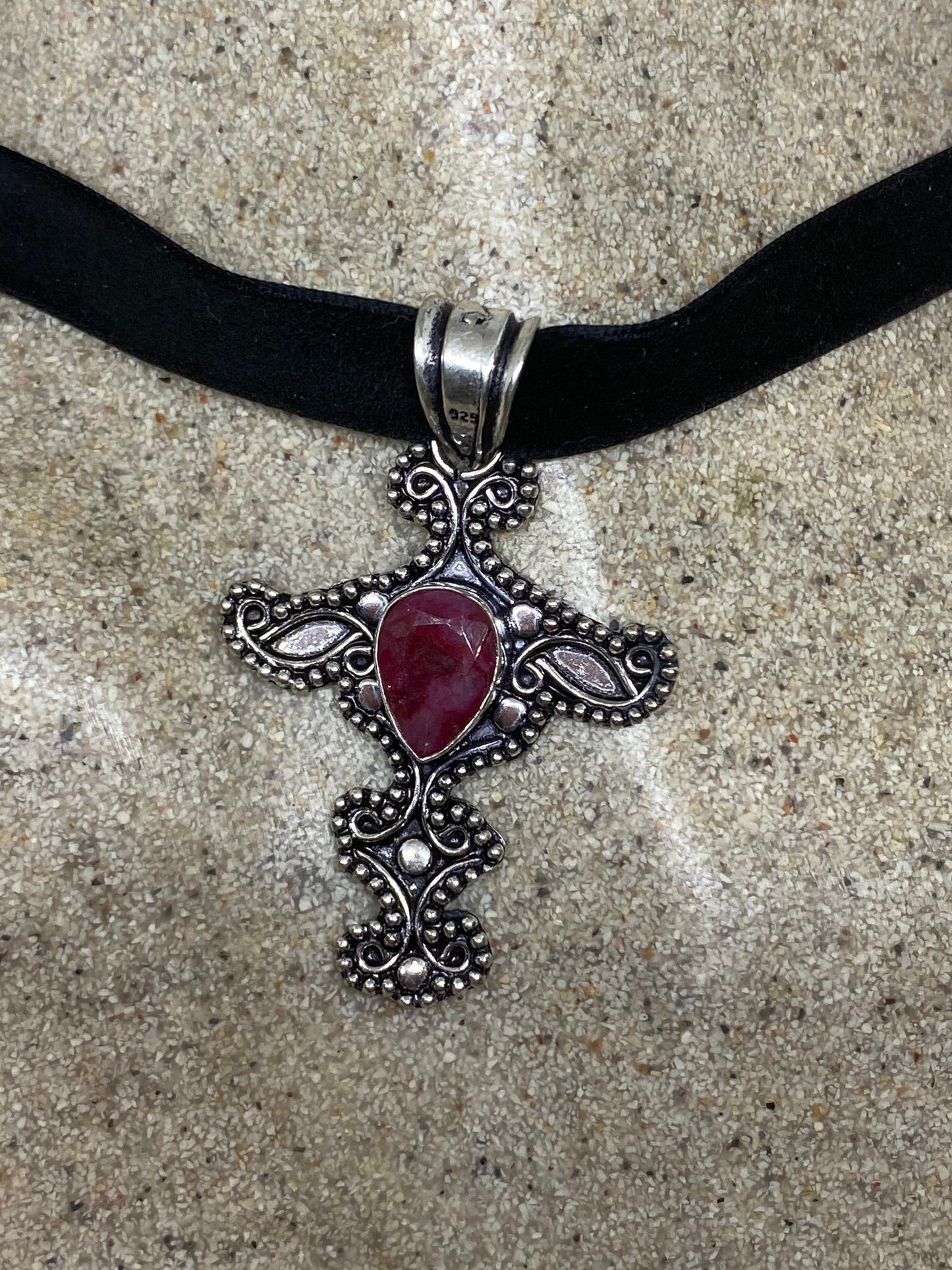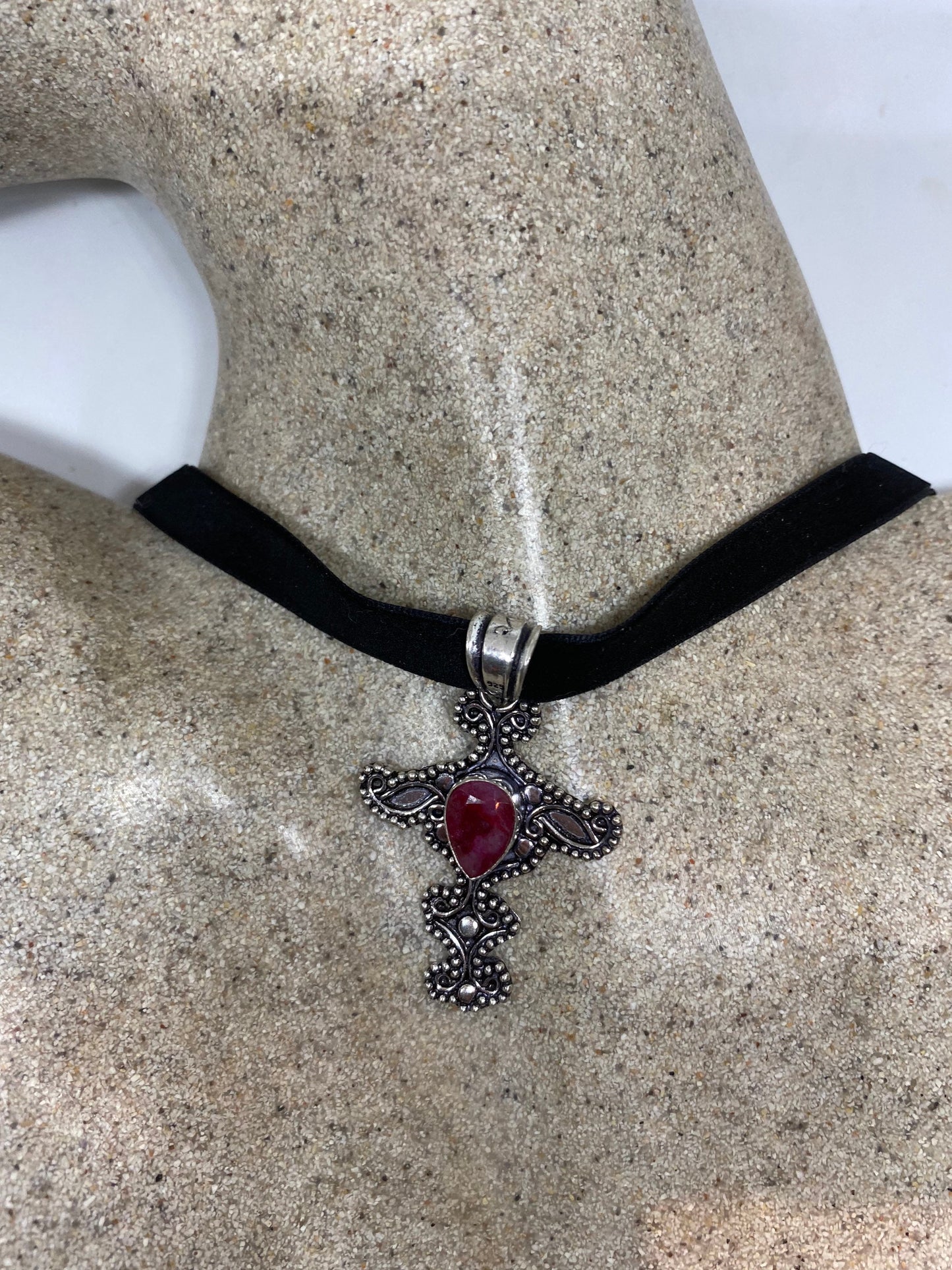 Vintage Pink Raw Ruby Cross Choker Pendant Necklace