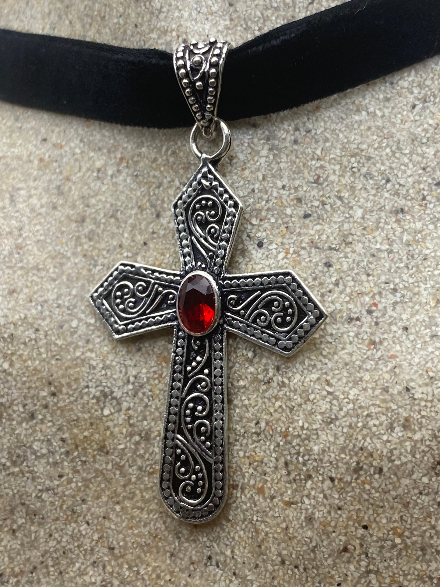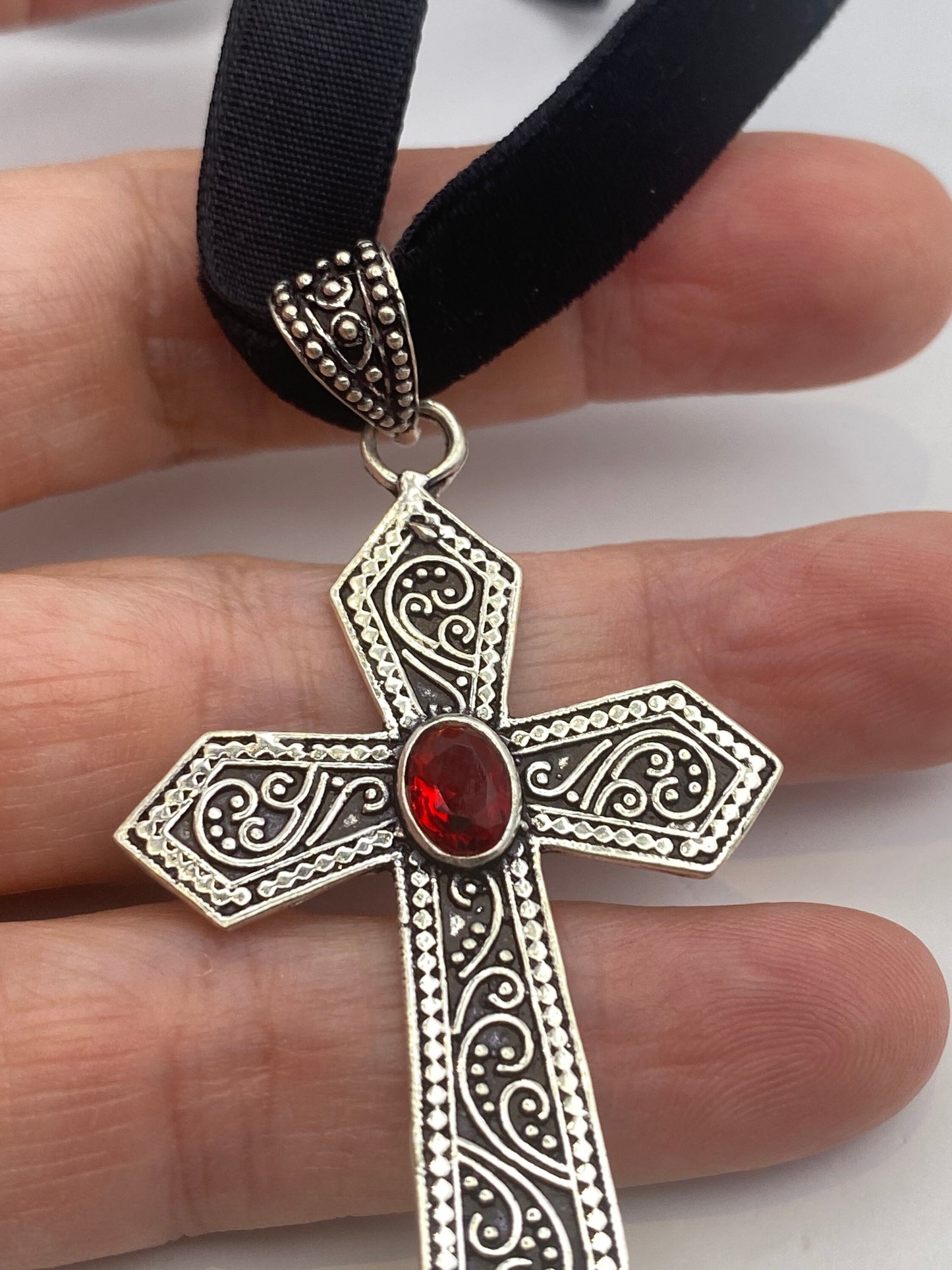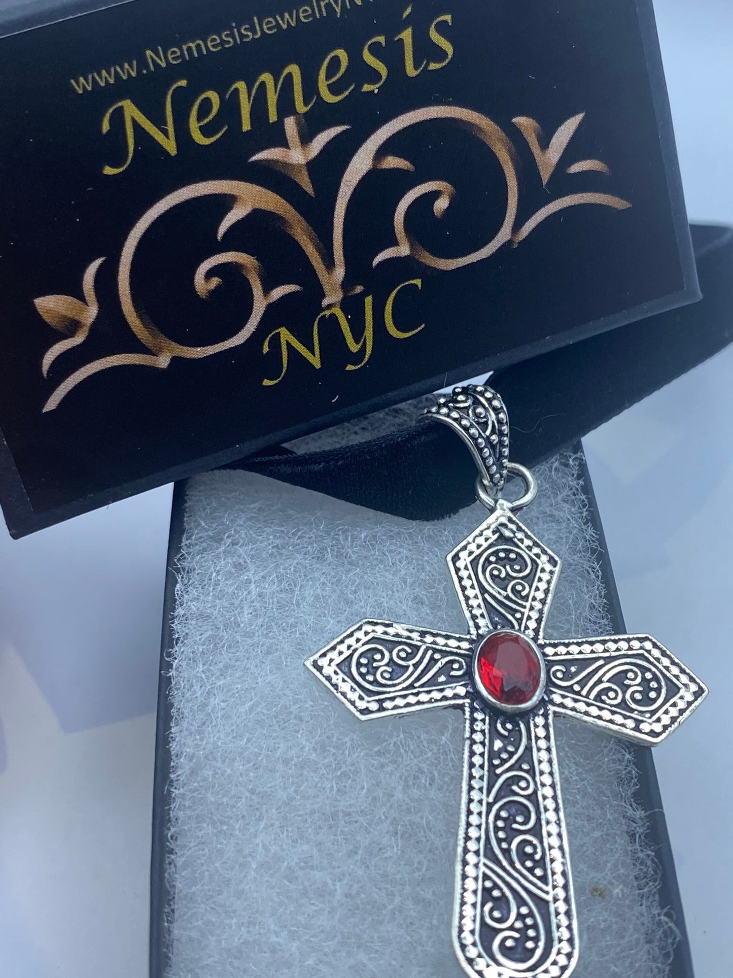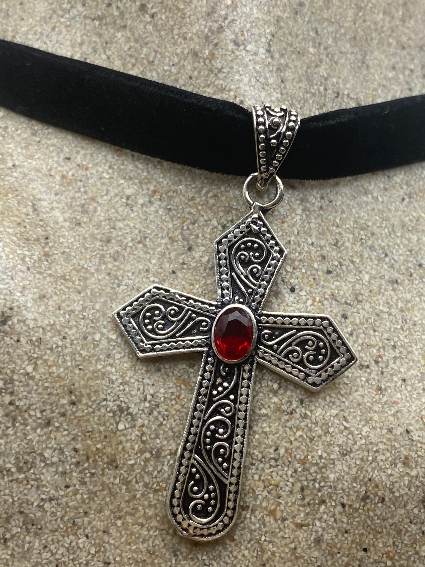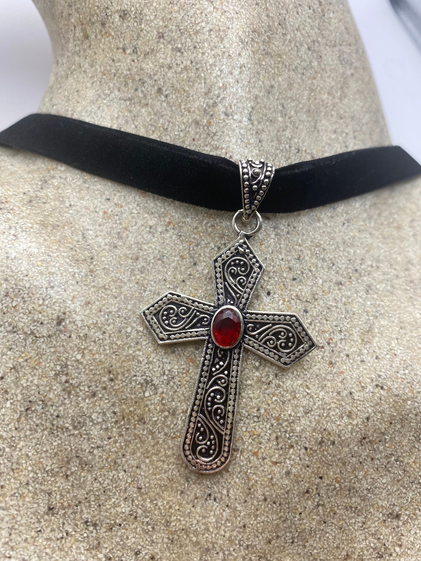 Vintage Red Garnet Glass Bronze Silver Cross Pendant