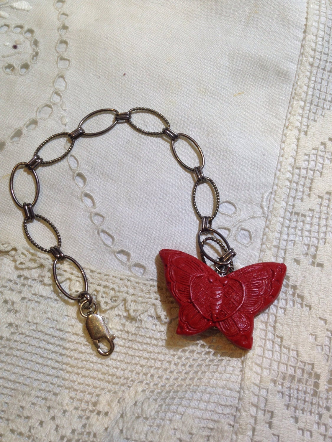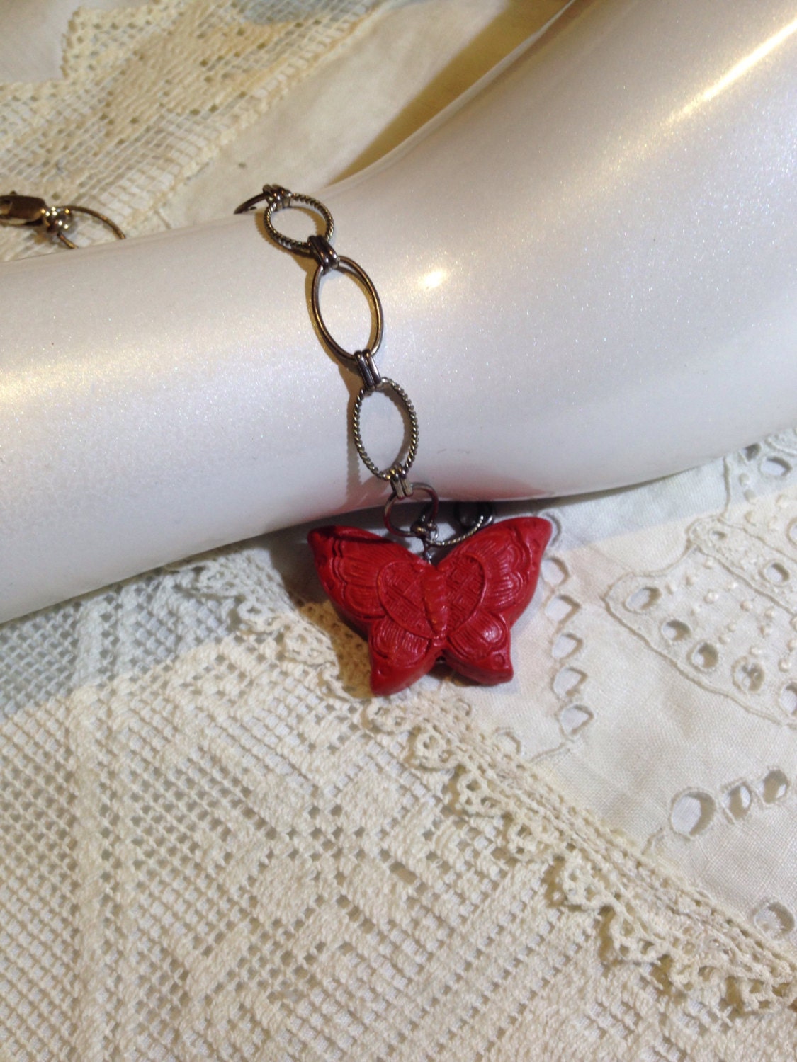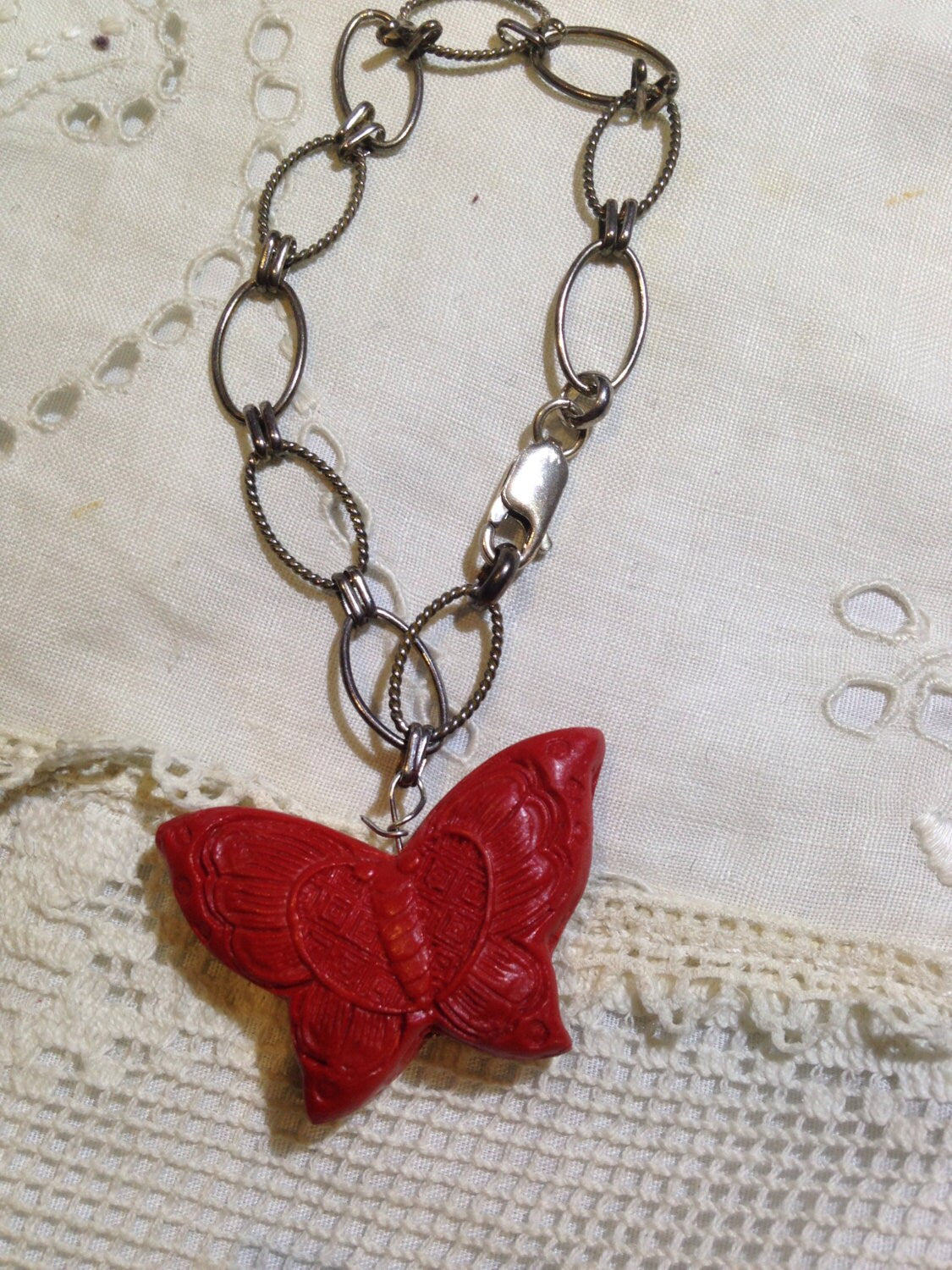 Vintage Streling Silver Genuine Cinnabar Charm Bracelet
