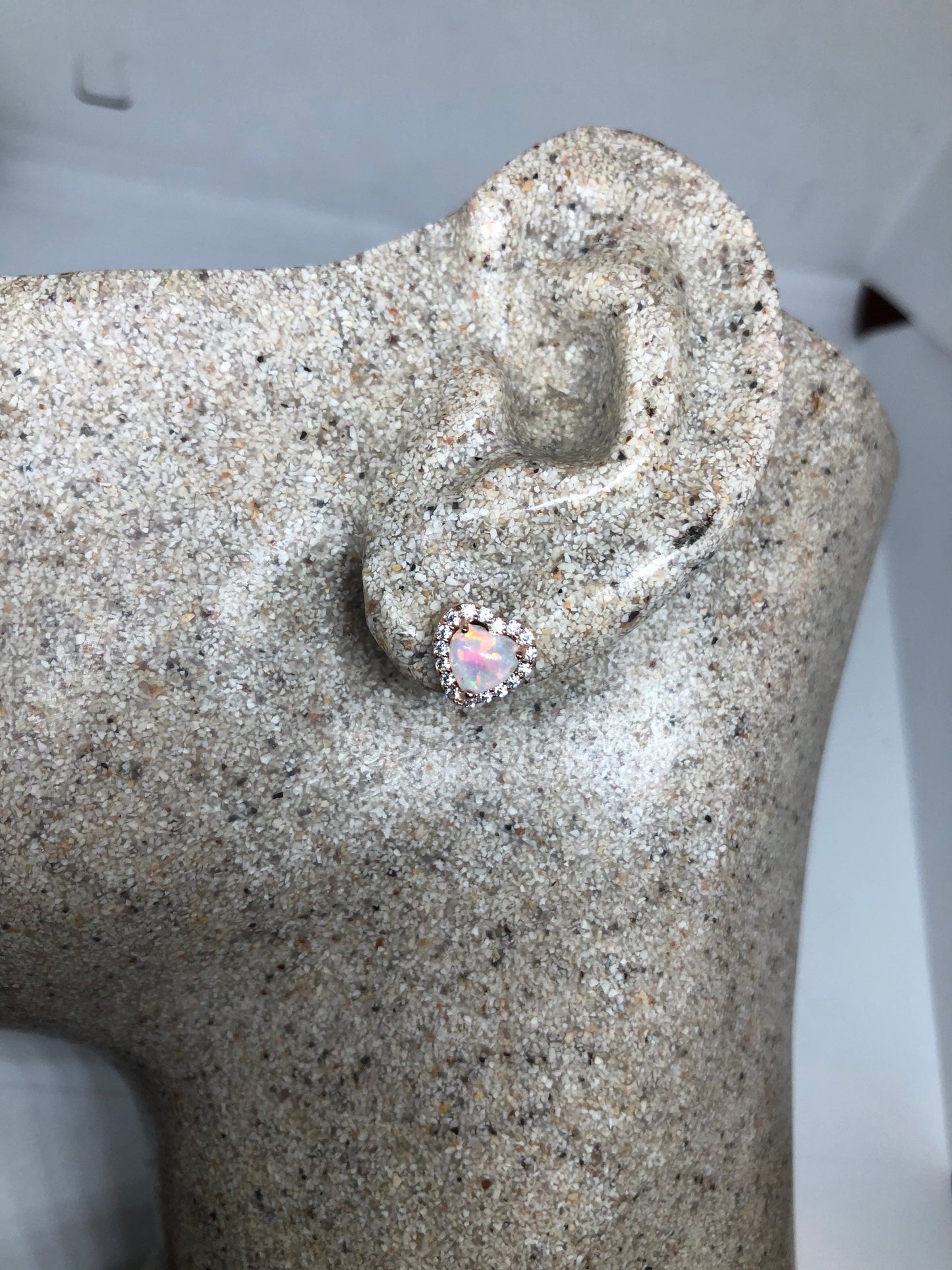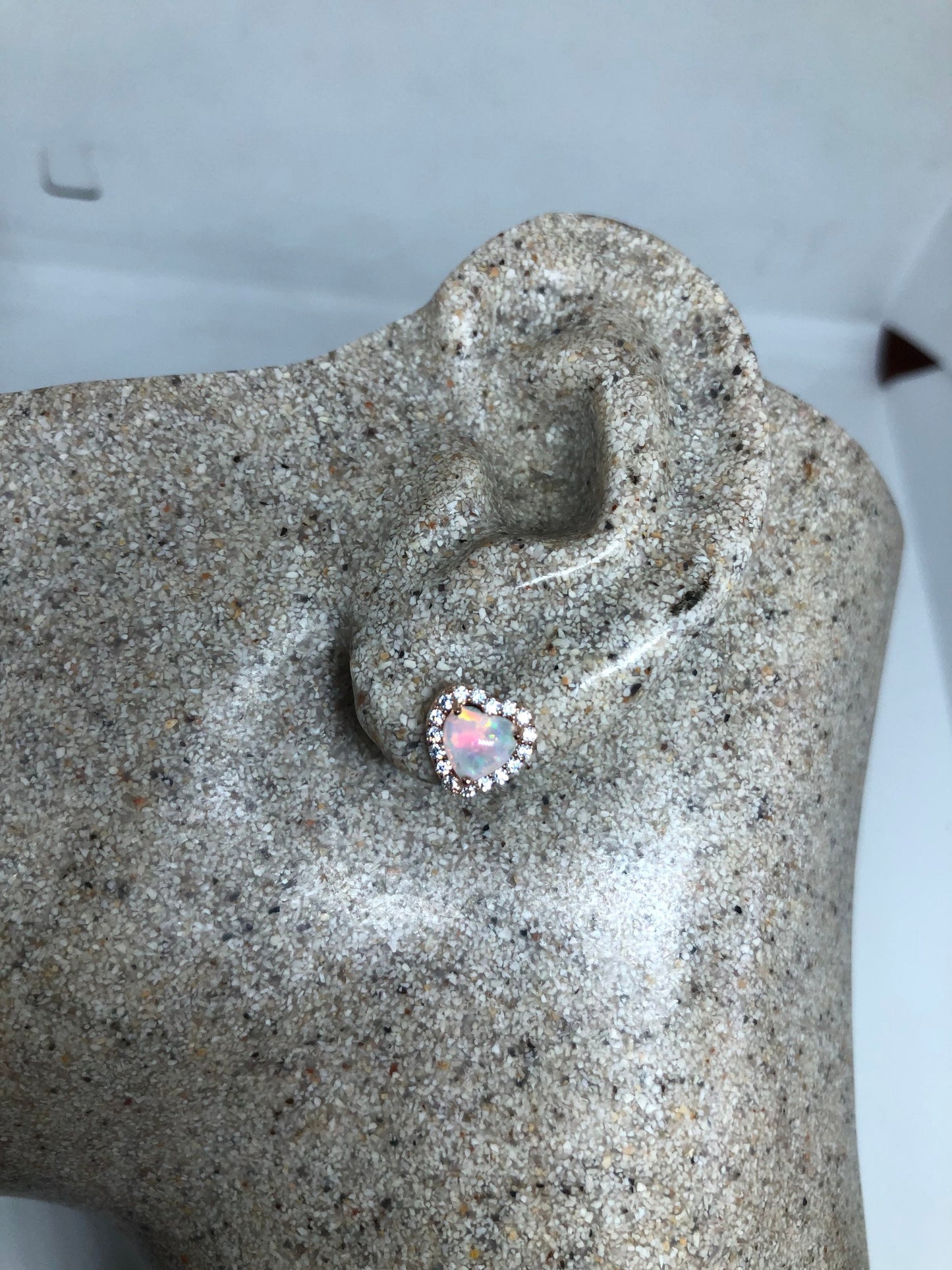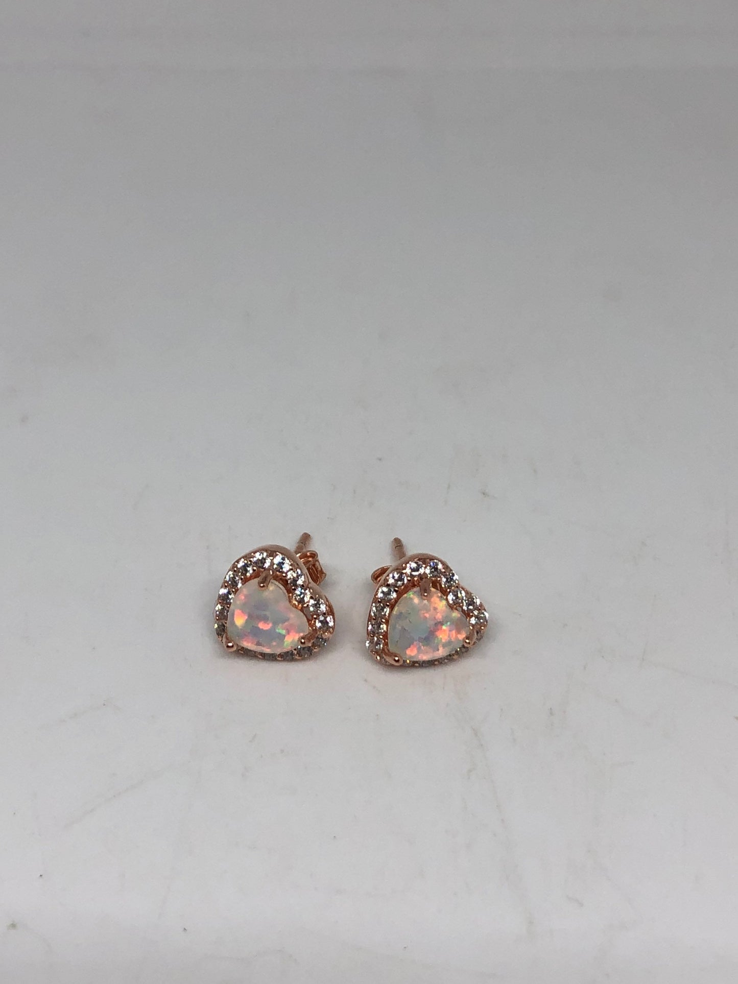 Vintage White Opal Heart Earrings Rose Golden 925 Sterling Silver Stud Button