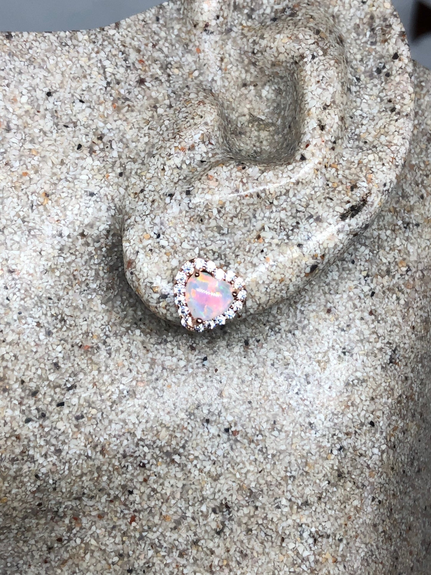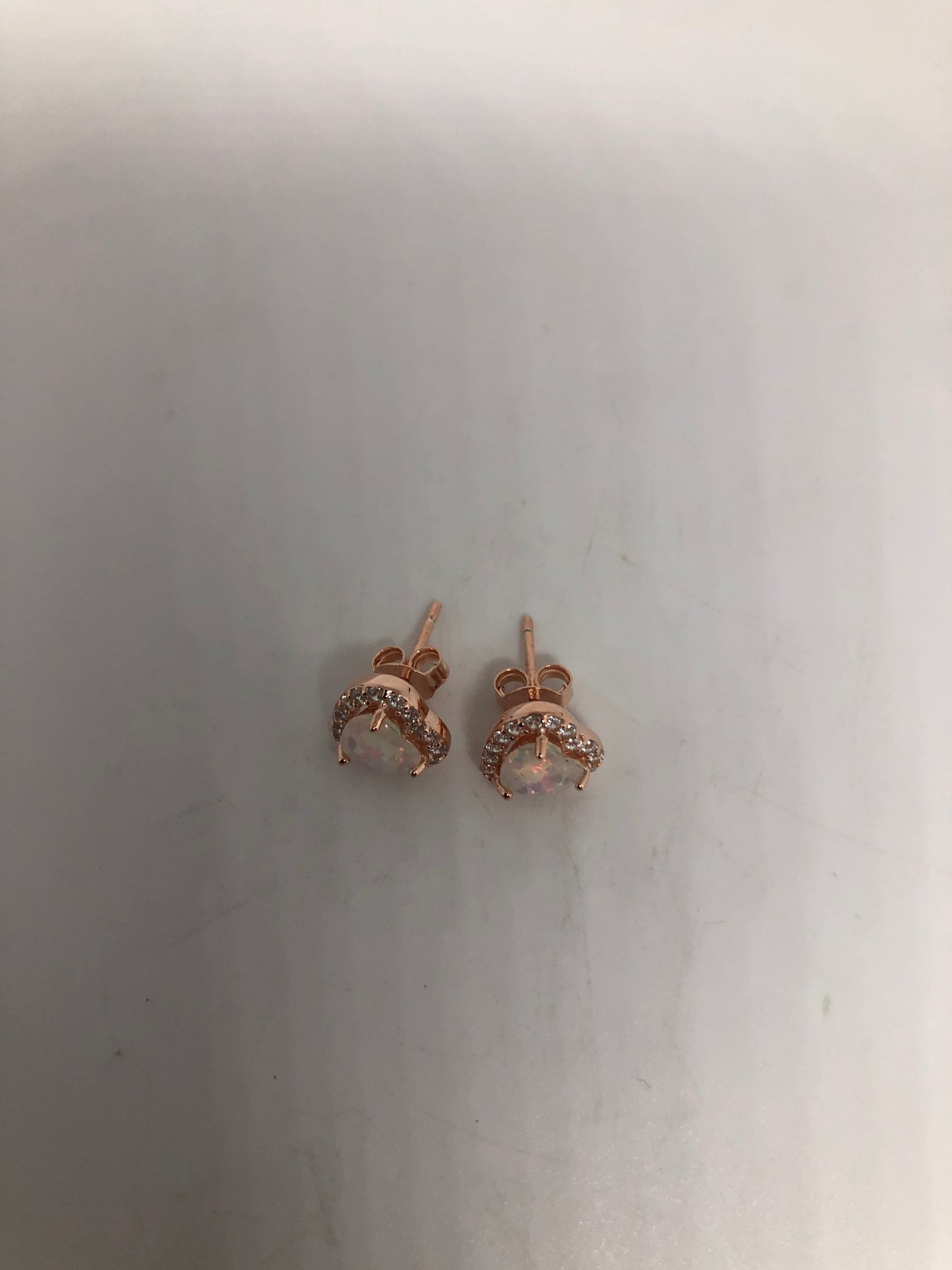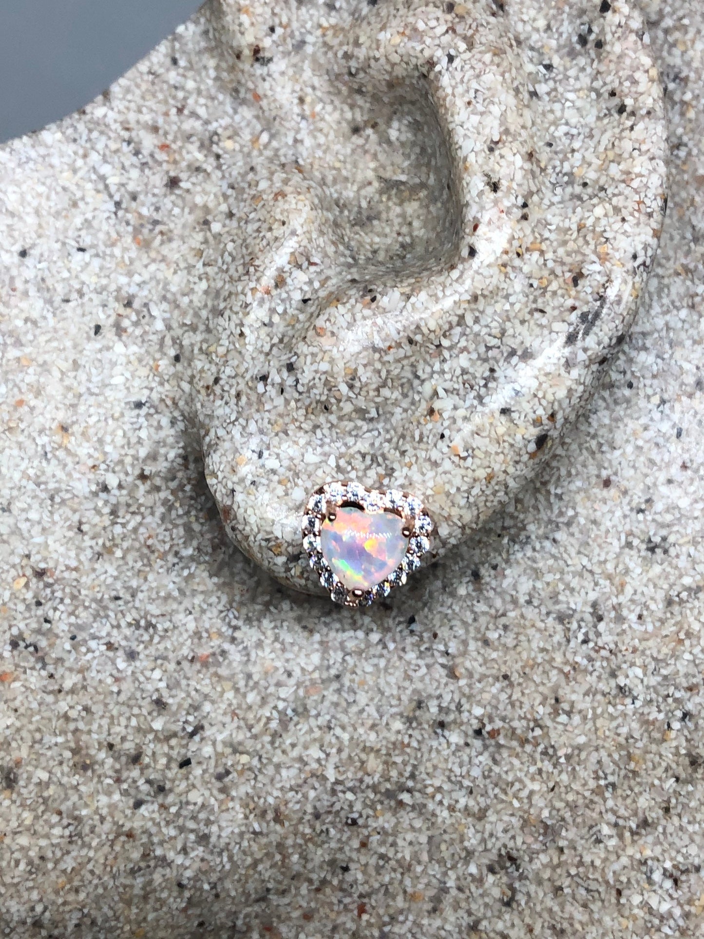 Vintage White Opal Heart Earrings Rose Golden 925 Sterling Silver Stud Button