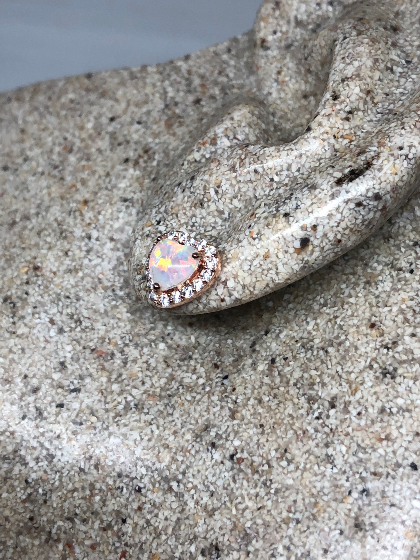 Delicate and detailed vintage rose golden Sterling Silver earrings set with Genuine Opal surrounded by white sapphire
