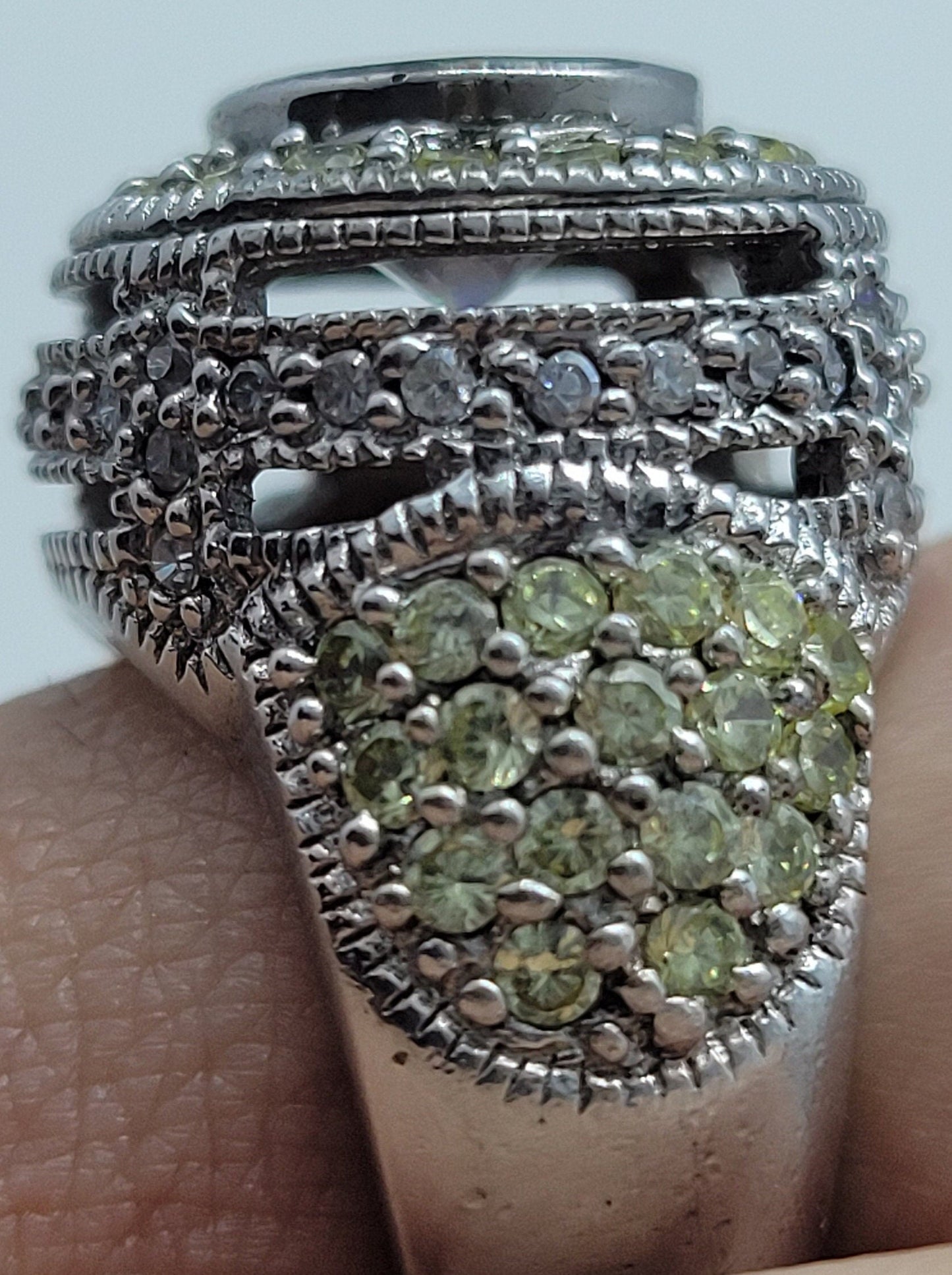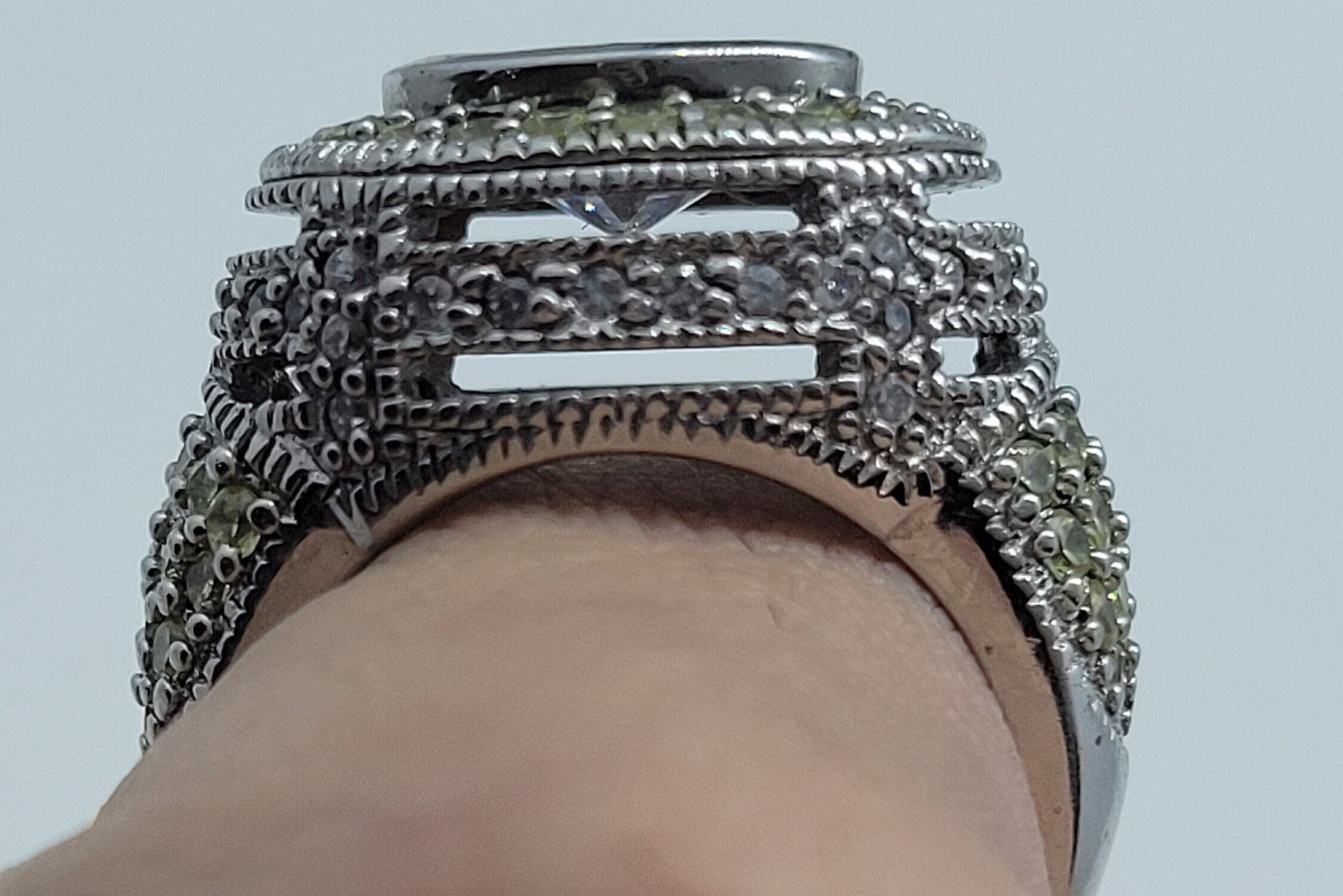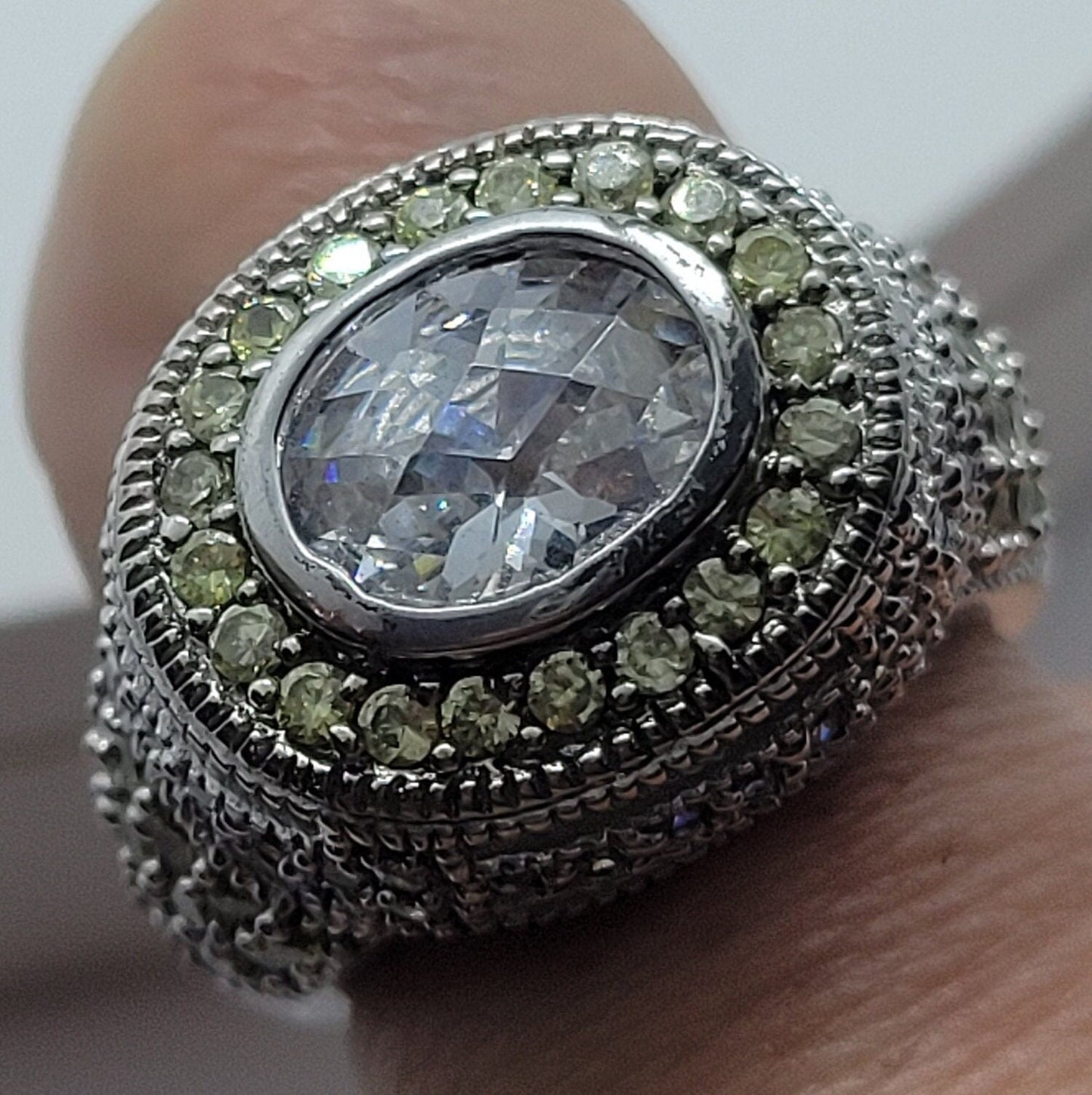 This ring is 925 sterling silver with a white topaz gemstone, set with white sapphires and green peridot.