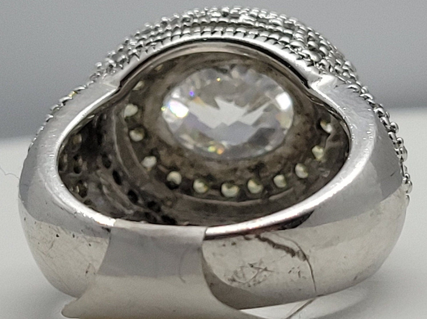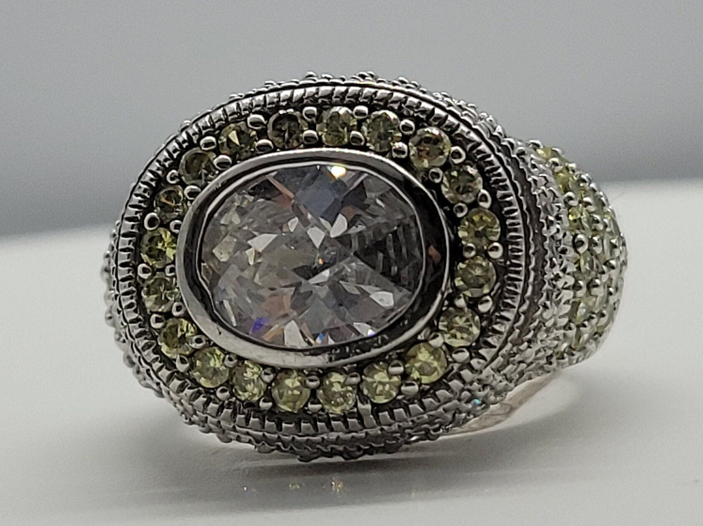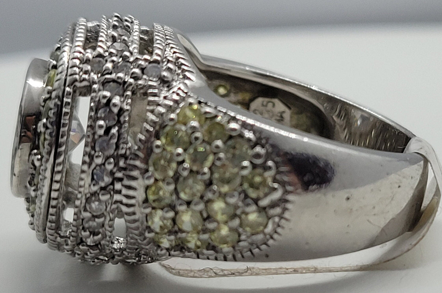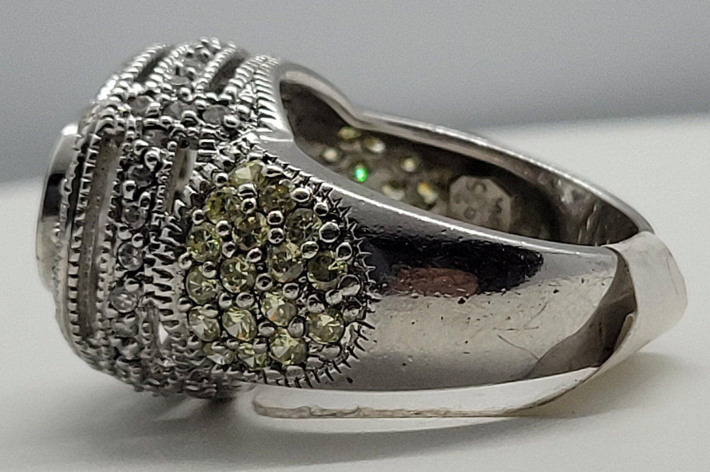 This ring is 925 sterling silver with a white topaz gemstone, set with white sapphires and green peridot.