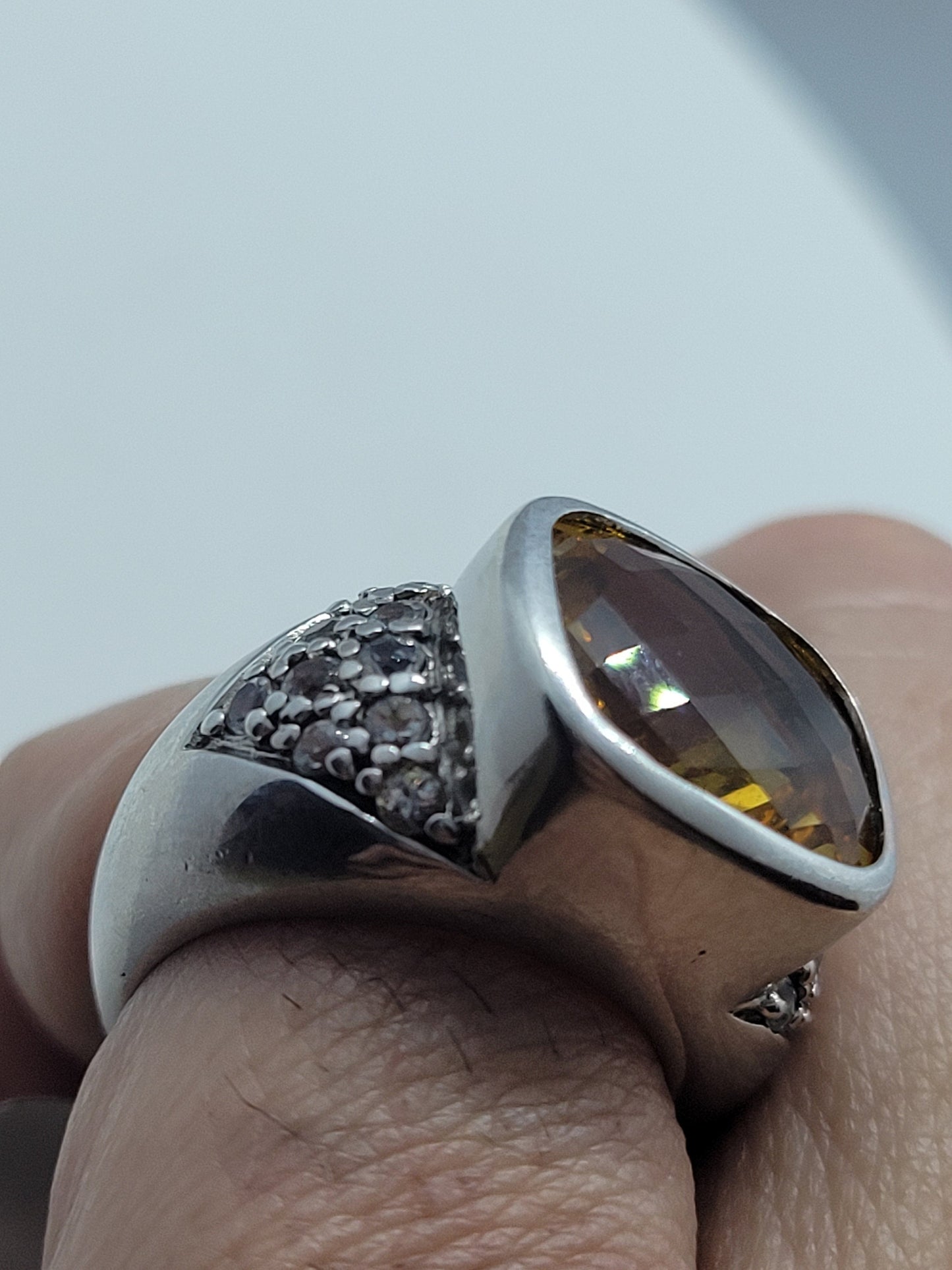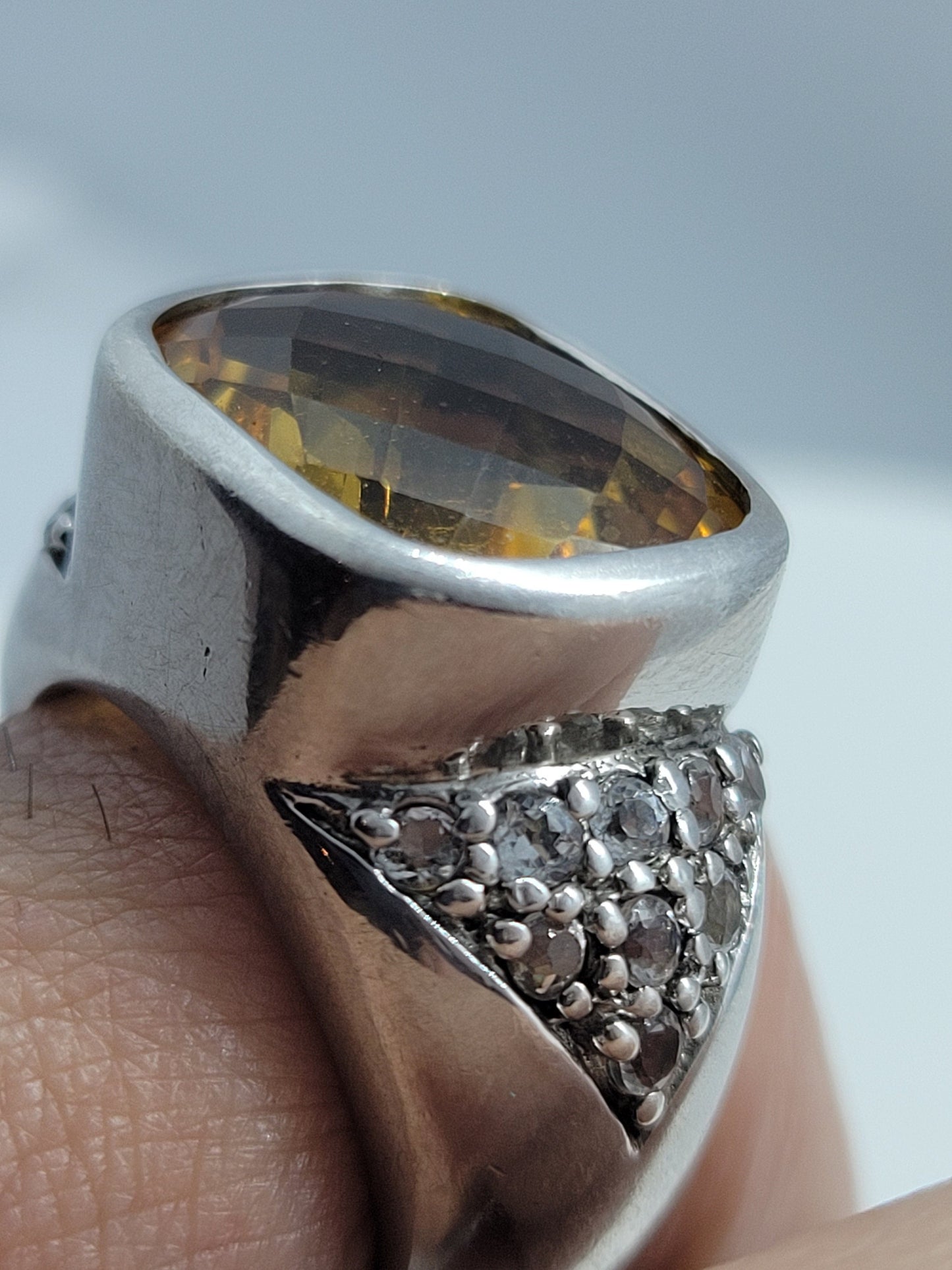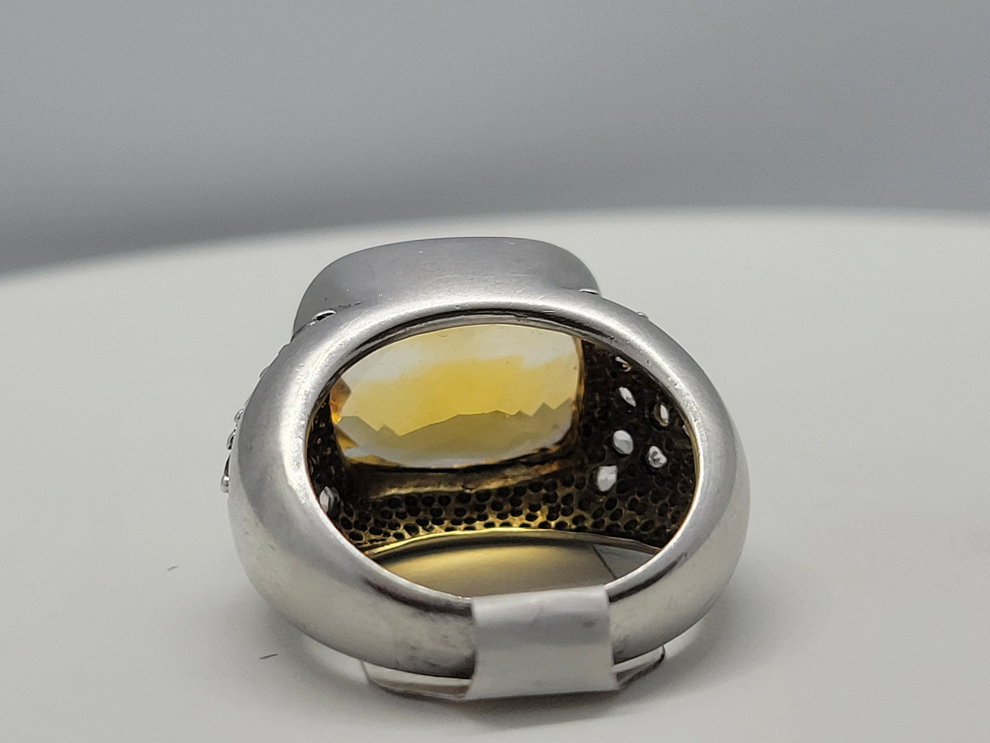 This ring is 925 sterling silver supporting a robust 11 mm x 13 mm yellow citrine and a base consisting of white sapphire pavé.