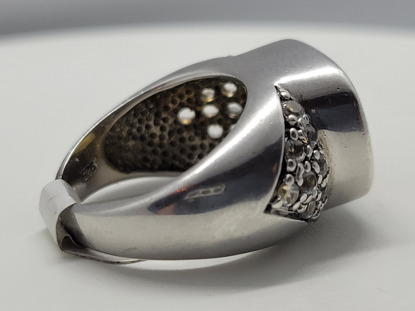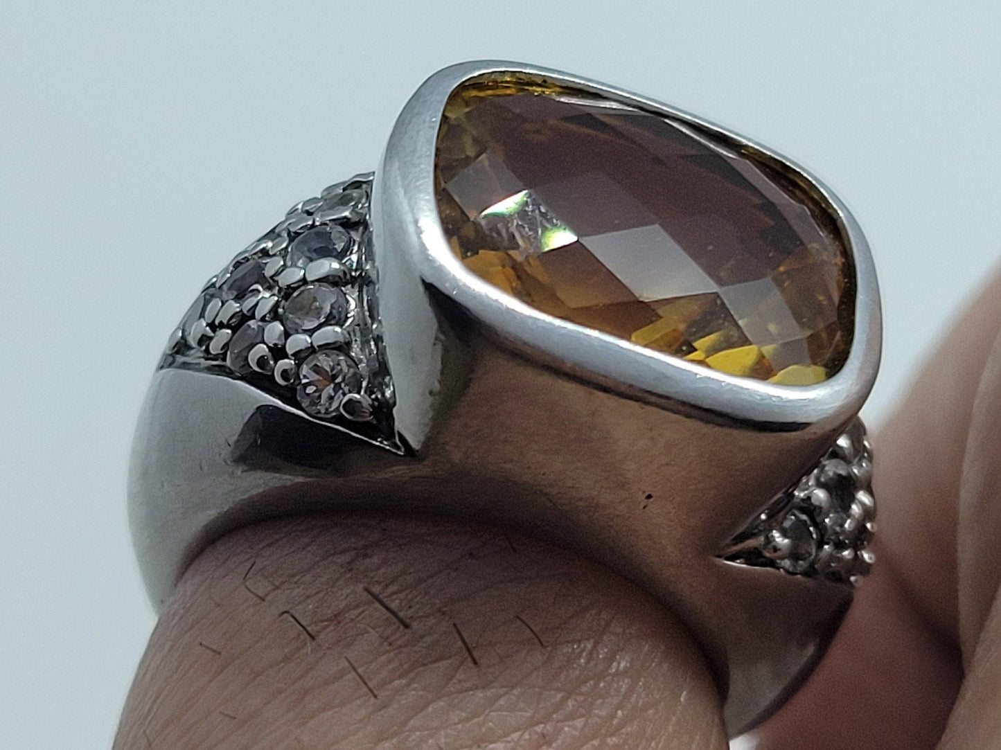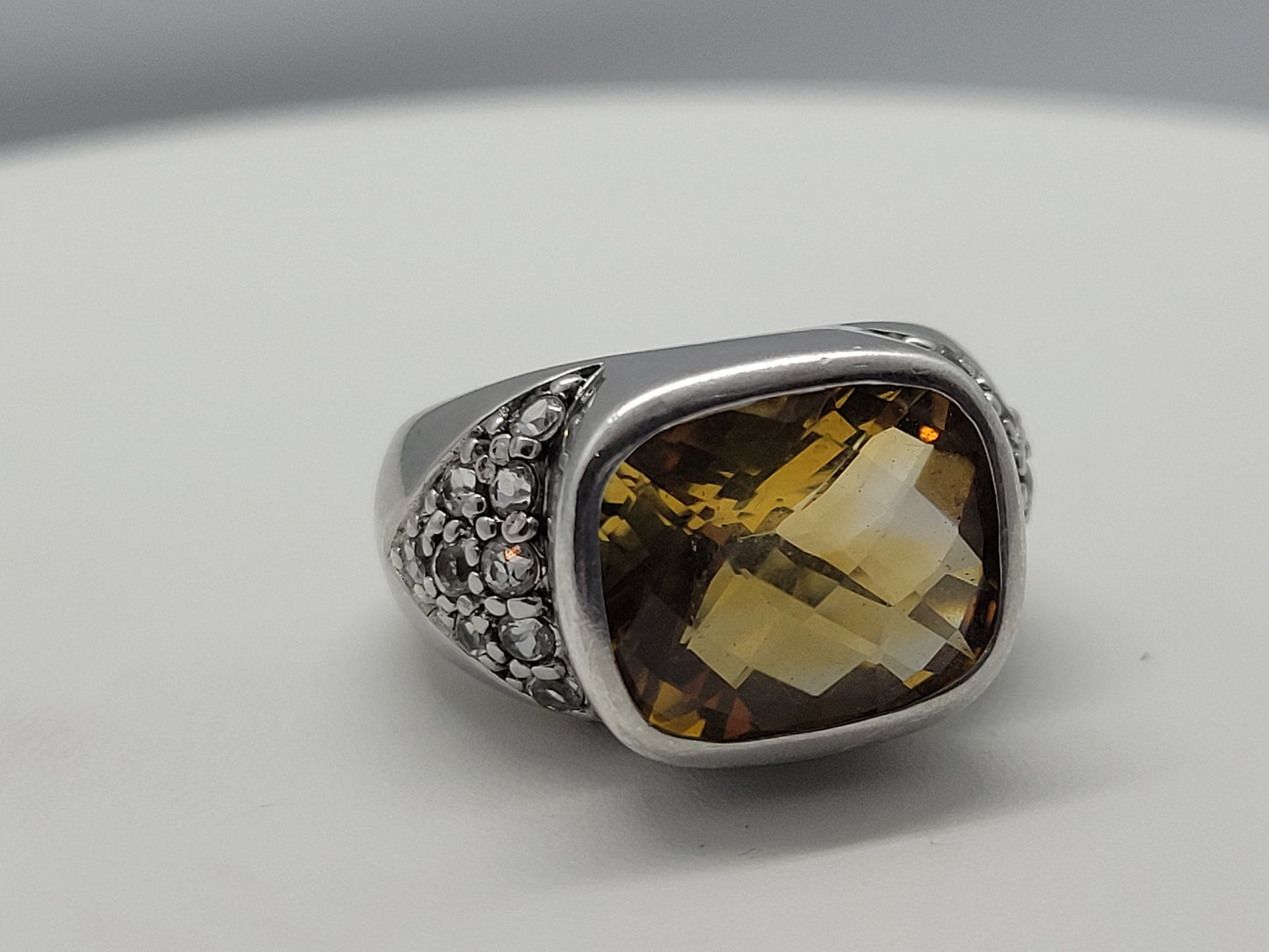 This ring is 925 sterling silver supporting a robust 11 mm x 13 mm yellow citrine and a base consisting of white sapphire pavé.