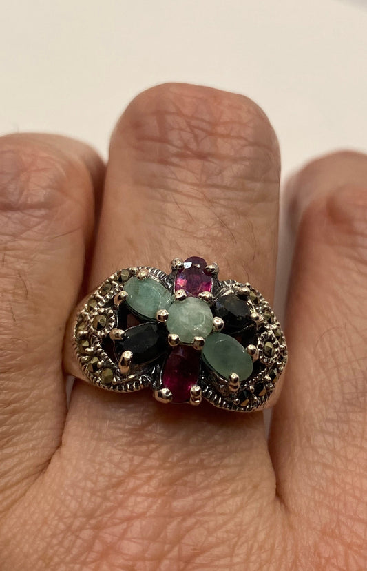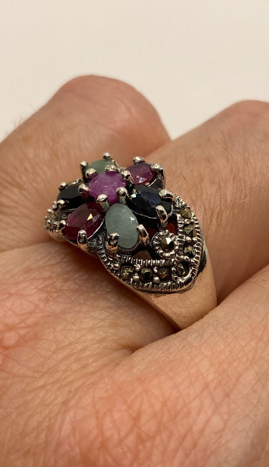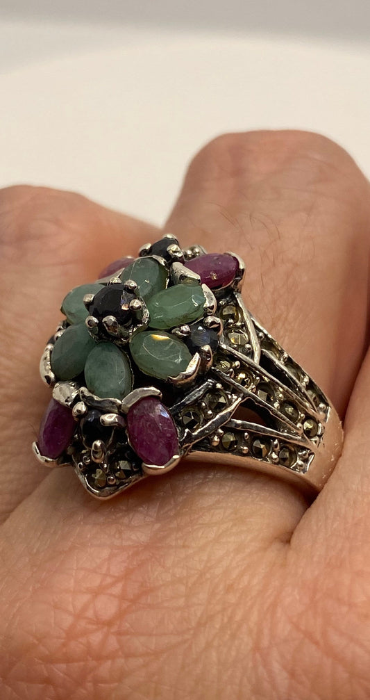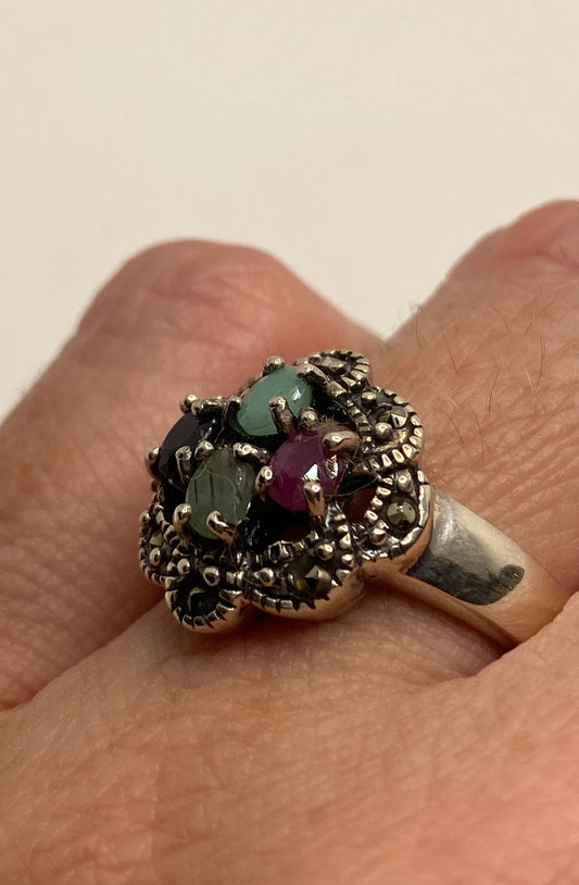 Vintage Emerald, Ruby, Sapphire Marcasite 925 Sterling Silver Cocktail Ring