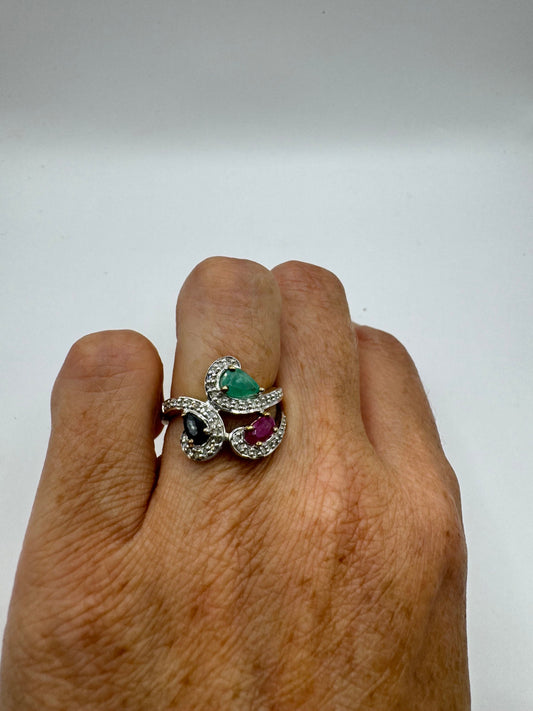 Vintage Emerald, Ruby, Sapphire Diamond Gold 925 Sterling Silver Cocktail Ring