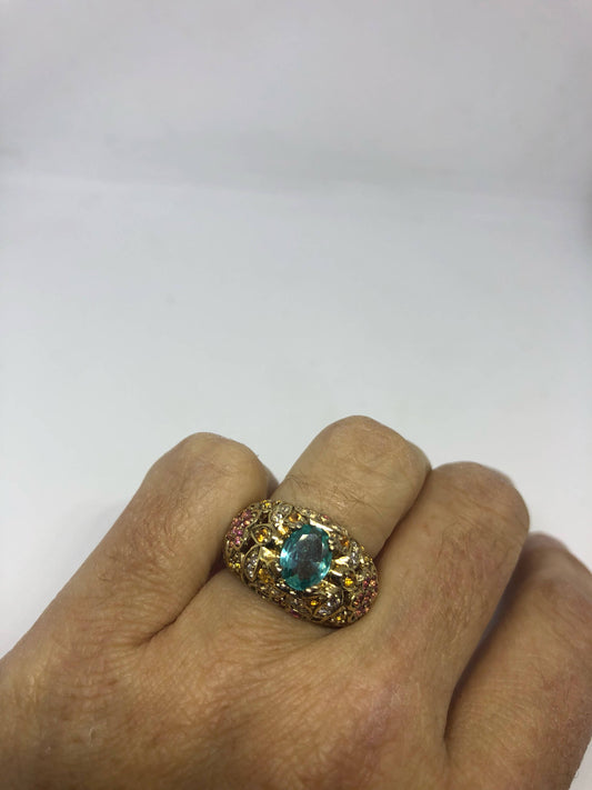 Vintage Handmade Blue Fluorite and Mixed Color Tourmaline Golden 925 Sterling Silver Gothic Ring