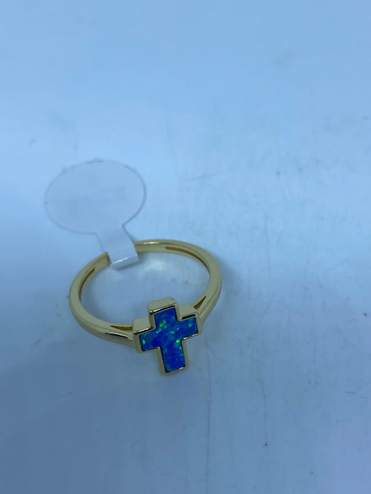 Vintage Handmade Blue Opal Cross 925 Sterling Silver Gold Rhodium Ring