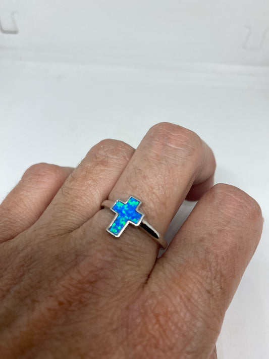 Vintage Handmade Blue Opal Cross 925 Sterling Silver Rhodium Ring