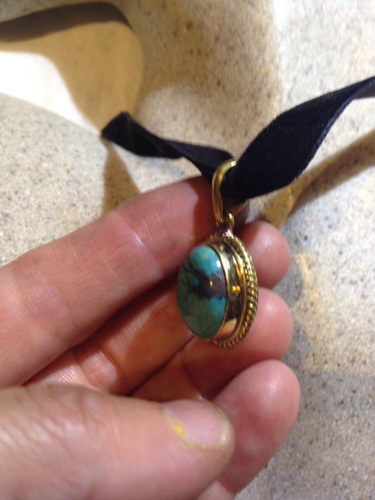 Large Handmade Vintage Engraved Repose Brass Turquoise Pendant