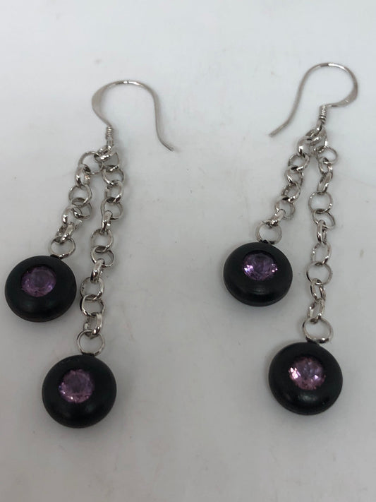 Vintage Amethyst Earrings 925 Sterling Silver Wooden Dangle