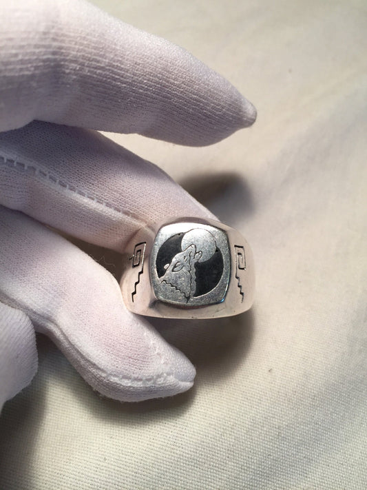 Vintage Wolf and Full Moon Mens Ring