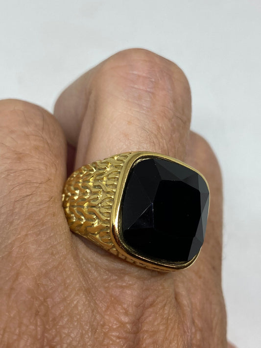 Vintage Black Onyx Golden Stainless Steel Mens Ring