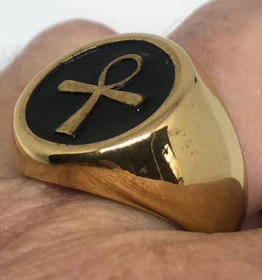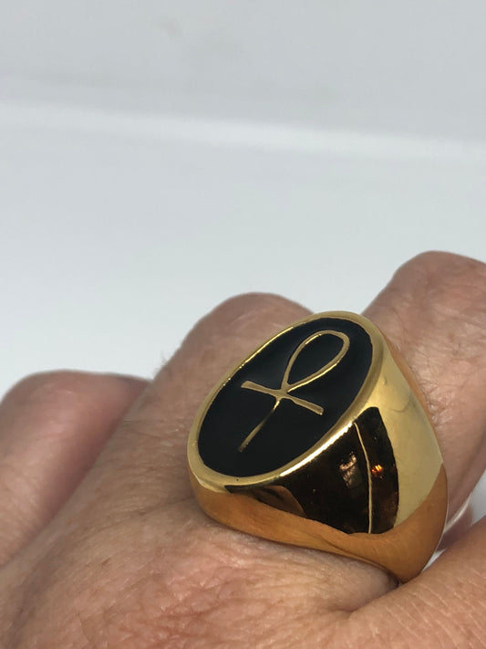Vintage Golden Stainless Steel Gothic Egyptian Ankh Mens Ring