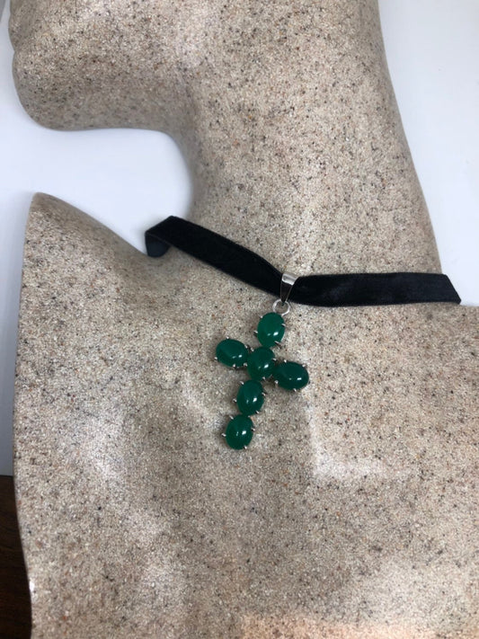 Vintage Green Onyx 925 Sterling Silver cross Necklace Choker