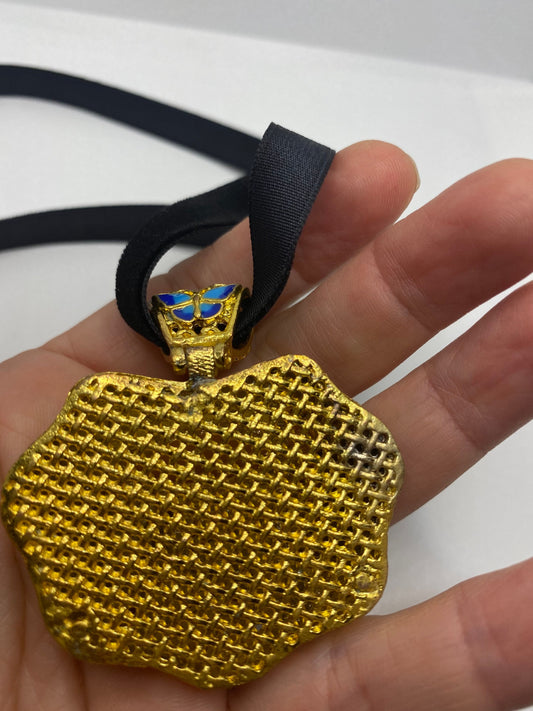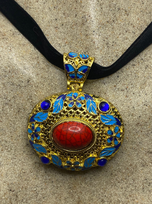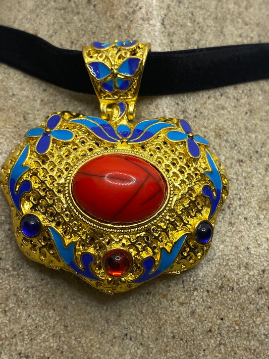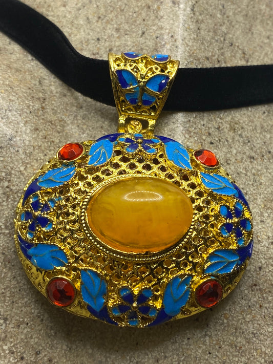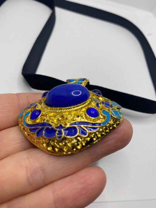 Vintage Cloisonné Choker Pendant Necklace Golden with Blue Enamel