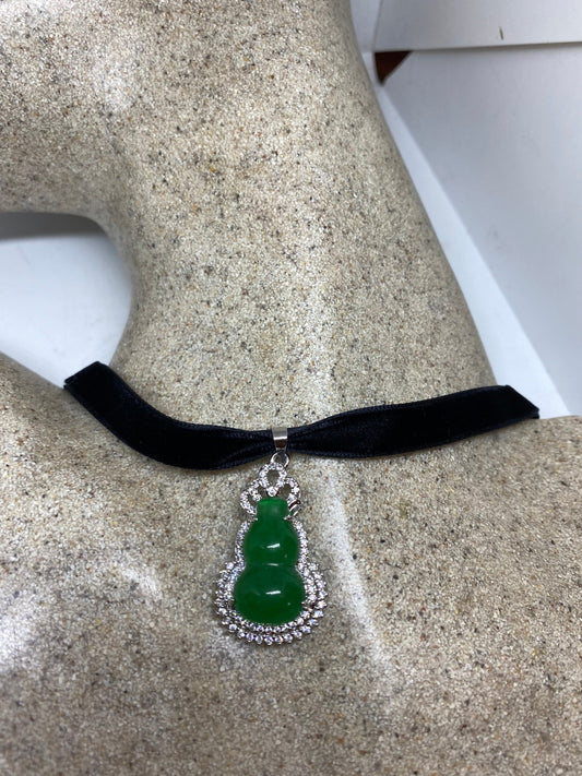Vintage Green Jade Buddhist Gourd Choker Necklace Pendant