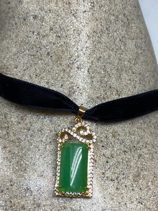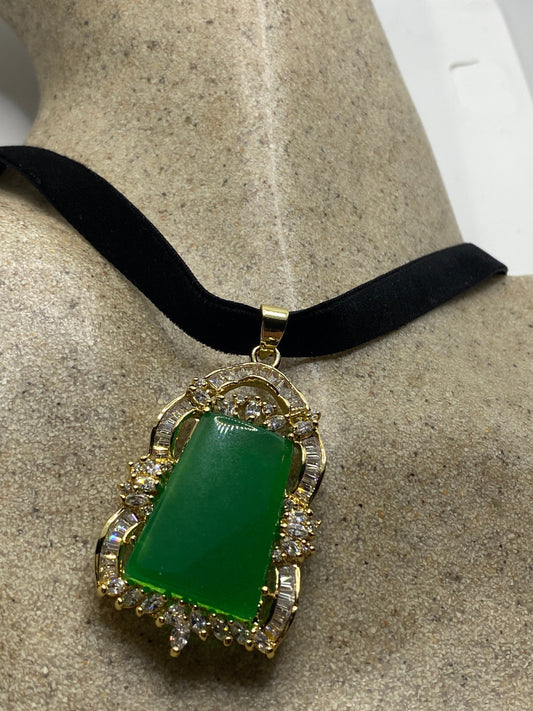 Vintage Green Jade Choker Gold Finish Necklace Pendant
