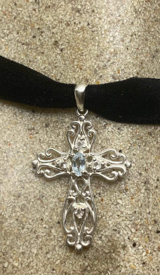 Vintage Aquamarine Cross Choker Necklace 925 Sterling Silver Pendant