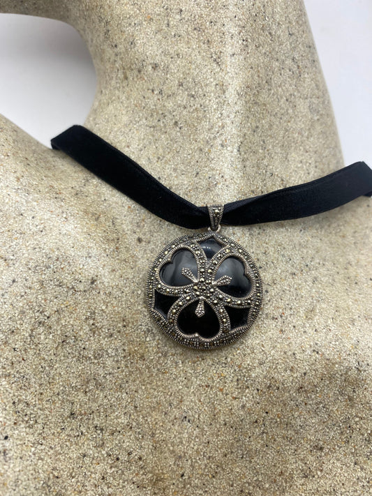 Vintage Black Onyx Marcasite Choker 925 Sterling Silver Deco Pendant Necklace