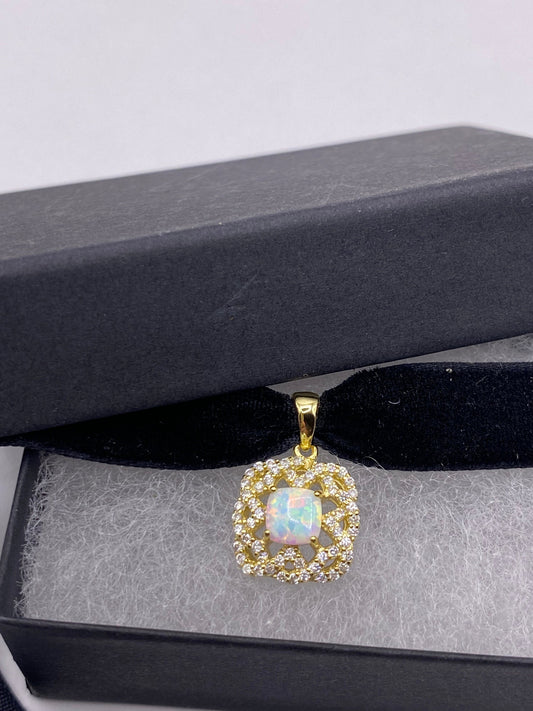 Vintage White Opal Choker Golden 925 Sterling Silver Pendant Necklace