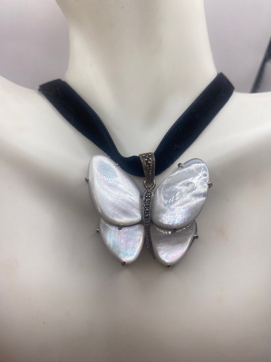 Vintage Deco Marcasite 925 Sterling Silver Mother of Pearl Deco Butterfly Pendant Necklace