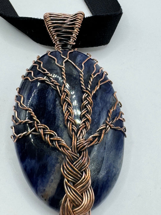 Bohemian Vintage Tree of Life Blue Genuine Sodalite Cloker Necklace Black Velvet ribbon