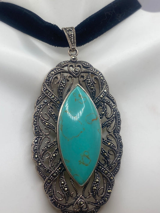 Vintage Marcasite Turquoise Howlite 925 Sterling Silver Velvet Choker Pendant Necklace