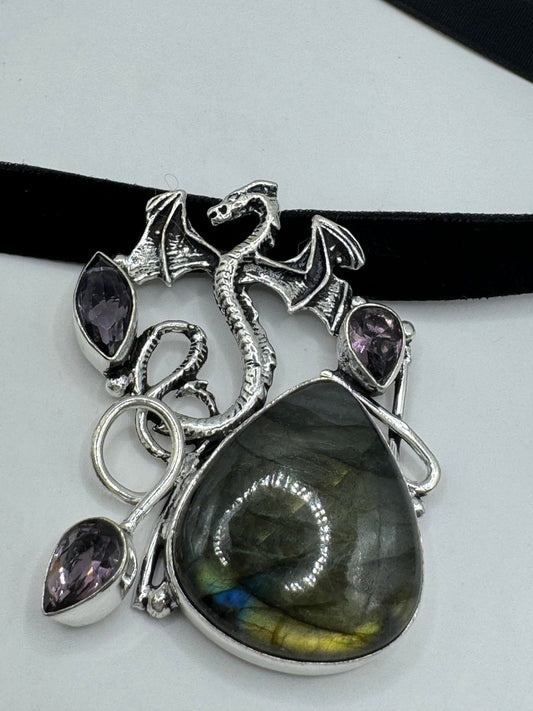 Vintage Silver Genuine Rainbow Labradorite Choker Black Velvet Necklace.