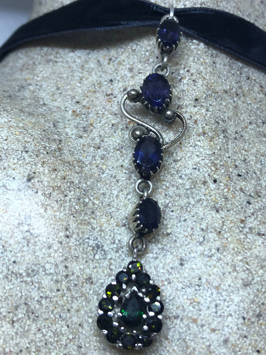 Vintage Blue Genuine Iolite And Green Tourmaline Antique 925 Sterling Silver Necklace